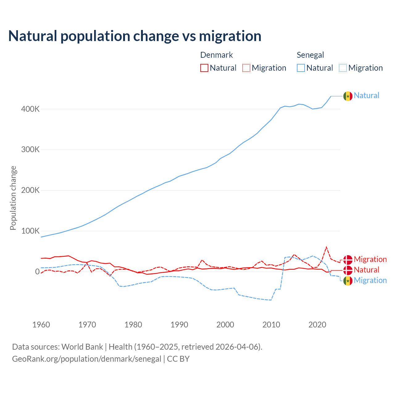 Over the last 10 years, 15.4% of the population change in Denmark is from natural causes (a gain of 51,826 people) and 84.6% is from migration (a gain of 284,848 people). In Senegal 93.9% is from natural causes (a gain of 4,089,205 people) and 6.13% is from migration (a gain of 267,266 people).