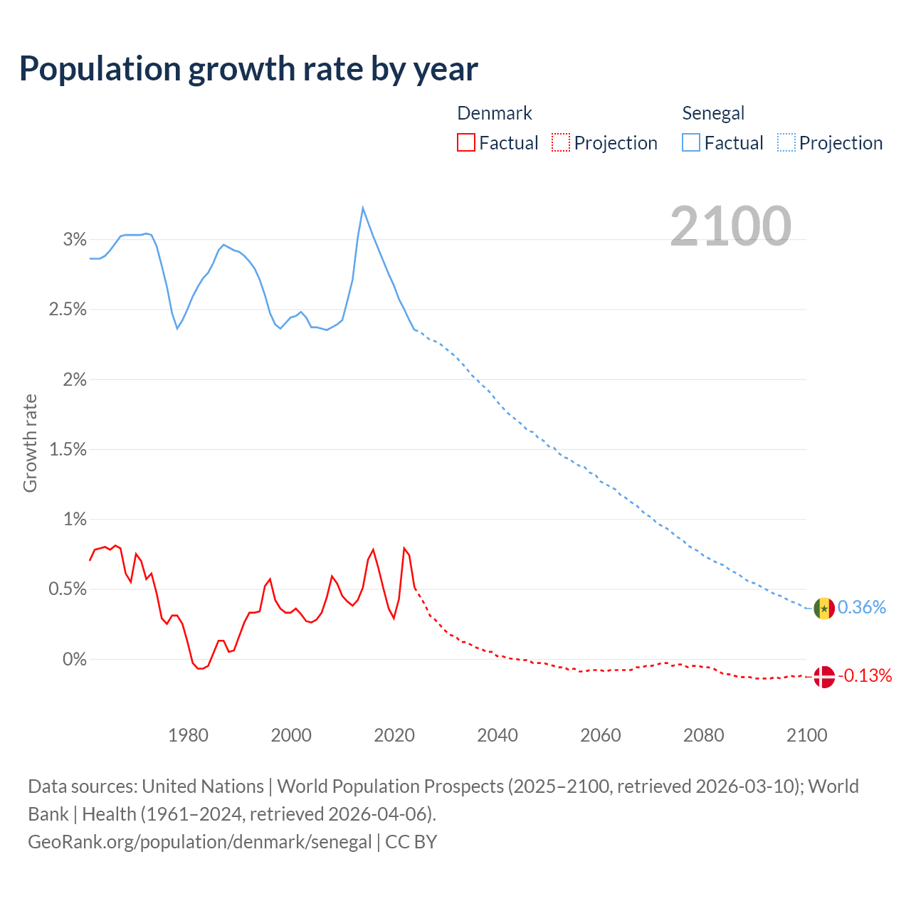 - For the last 10 years, Denmark has had an average growth rate of +0.57% per year vs +2.76% in Senegal.