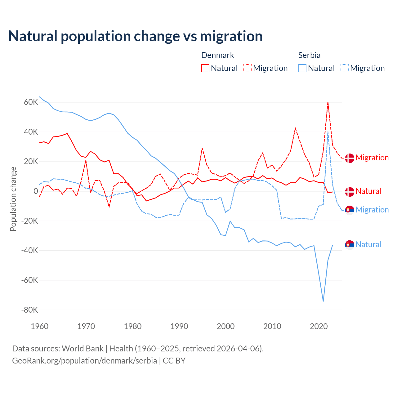 Over the last 10 years, 15.4% of the population change in Denmark is from natural causes (a gain of 51,826 people) and 84.6% is from migration (a gain of 284,848 people). In Serbia 83.3% is from natural causes (a loss of 435,148 people) and 16.7% is from migration (a loss of 87,110 people).
