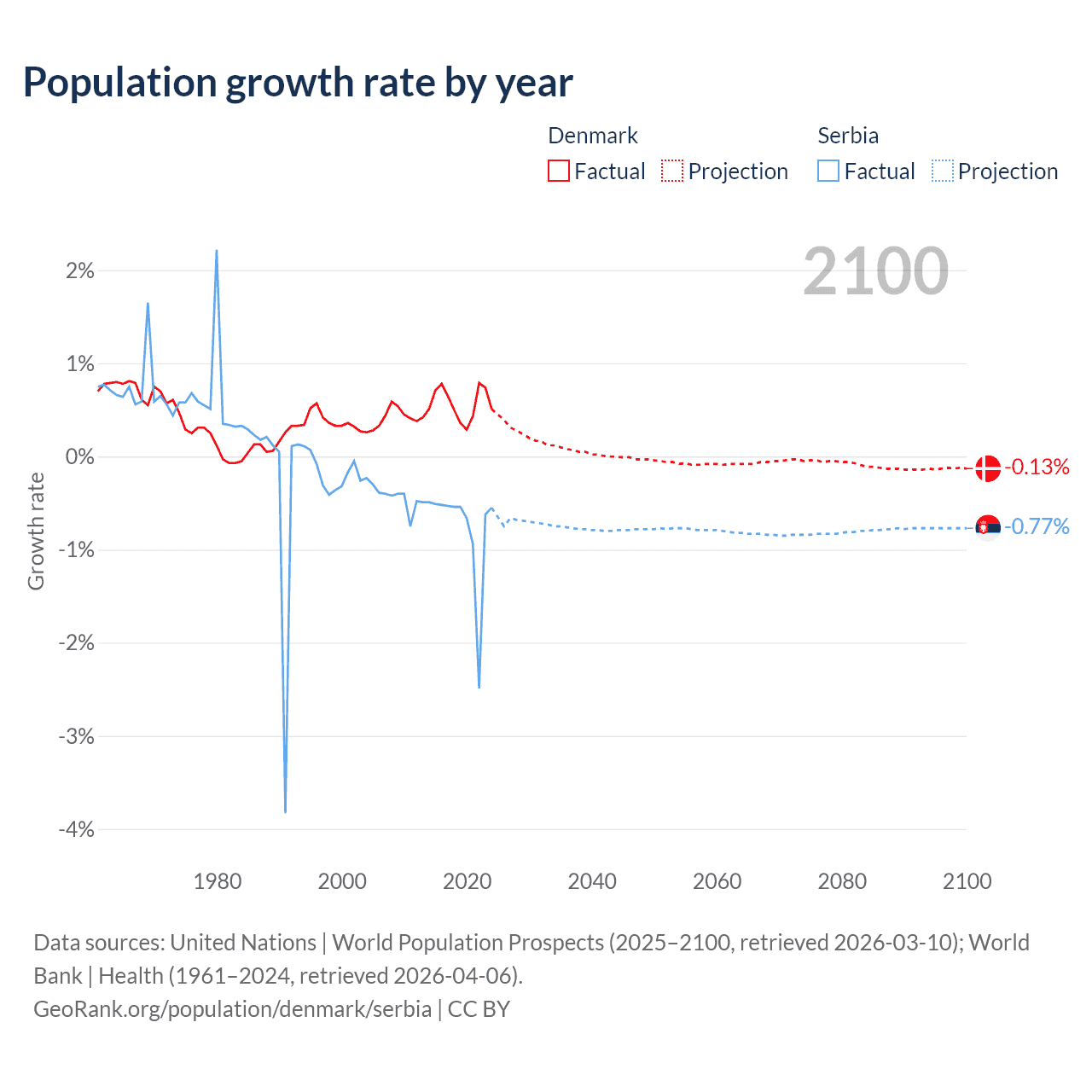 - For the last 10 years, Denmark has had an average growth rate of +0.57% per year vs -0.76% in Serbia.