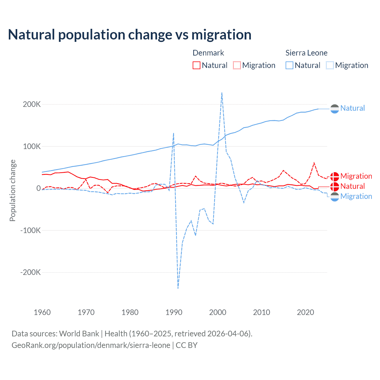 Over the last 10 years, 15.4% of the population change in Denmark is from natural causes (a gain of 51,826 people) and 84.6% is from migration (a gain of 284,848 people). In Sierra Leone 99.6% is from natural causes (a gain of 1,764,049 people) and 0.41% is from migration (a loss of 7,211 people).