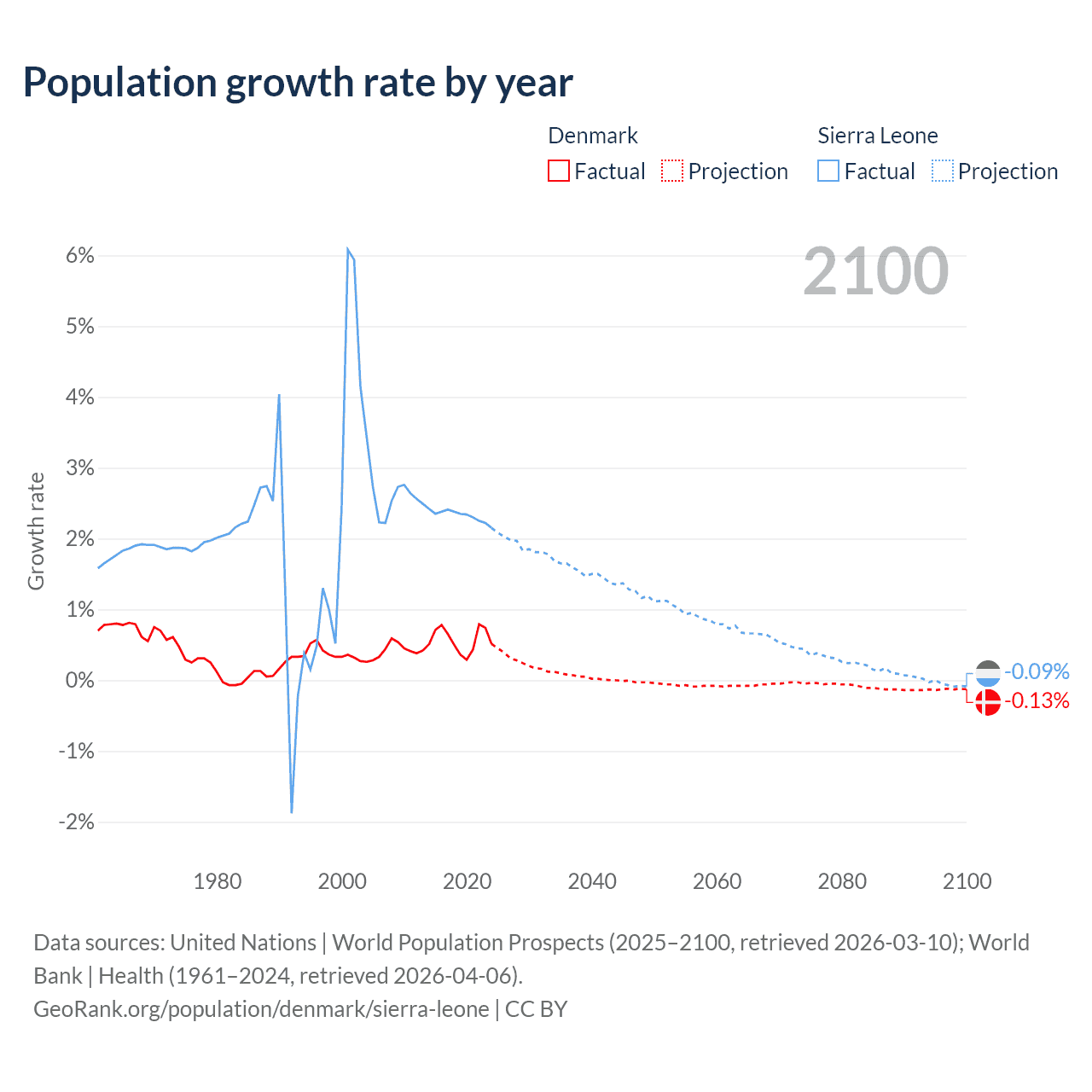 - For the last 10 years, Denmark has had an average growth rate of +0.57% per year vs +2.32% in Sierra Leone.