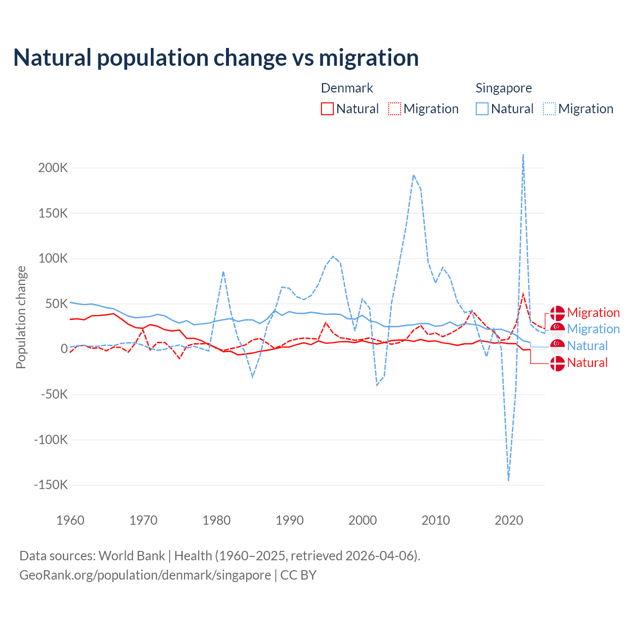Over the last 10 years, 15.4% of the population change in Denmark is from natural causes (a gain of 51,826 people) and 84.6% is from migration (a gain of 284,848 people). In Singapore 54.8% is from natural causes (a gain of 195,953 people) and 45.2% is from migration (a gain of 161,805 people).