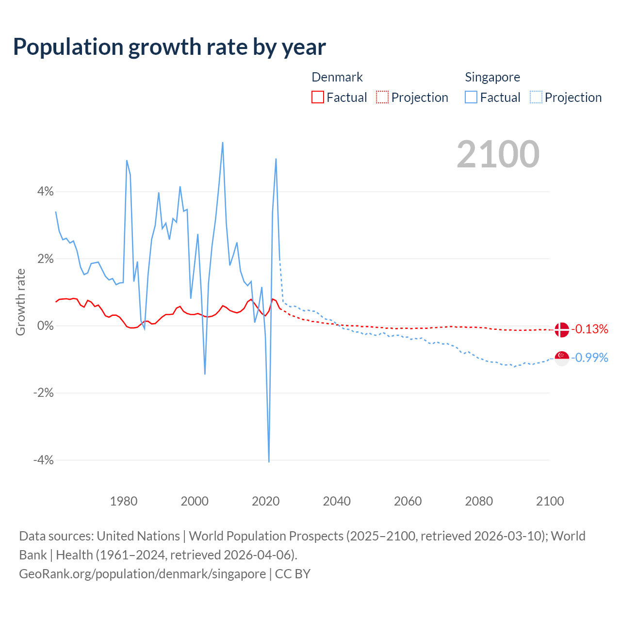 - For the last 10 years, Denmark has had an average growth rate of +0.57% per year vs +1.04% in Singapore.