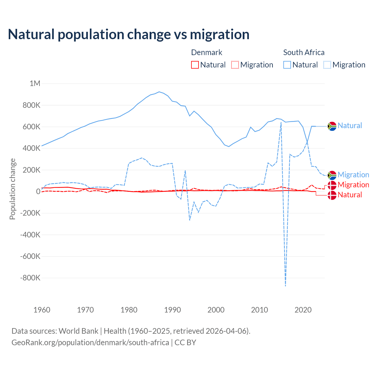 Over the last 10 years, 15.4% of the population change in Denmark is from natural causes (a gain of 51,826 people) and 84.6% is from migration (a gain of 284,848 people). In South Africa 72.8% is from natural causes (a gain of 6,190,027 people) and 27.2% is from migration (a gain of 2,316,795 people).
