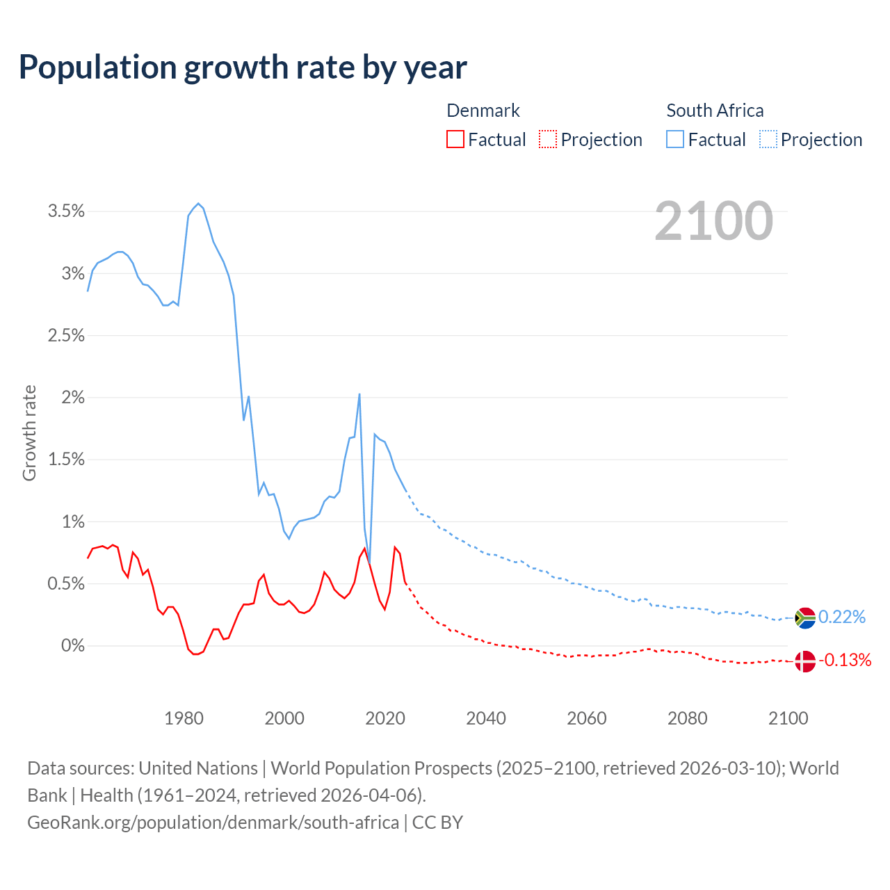 - For the last 10 years, Denmark has had an average growth rate of +0.57% per year vs +1.44% in South Africa.
