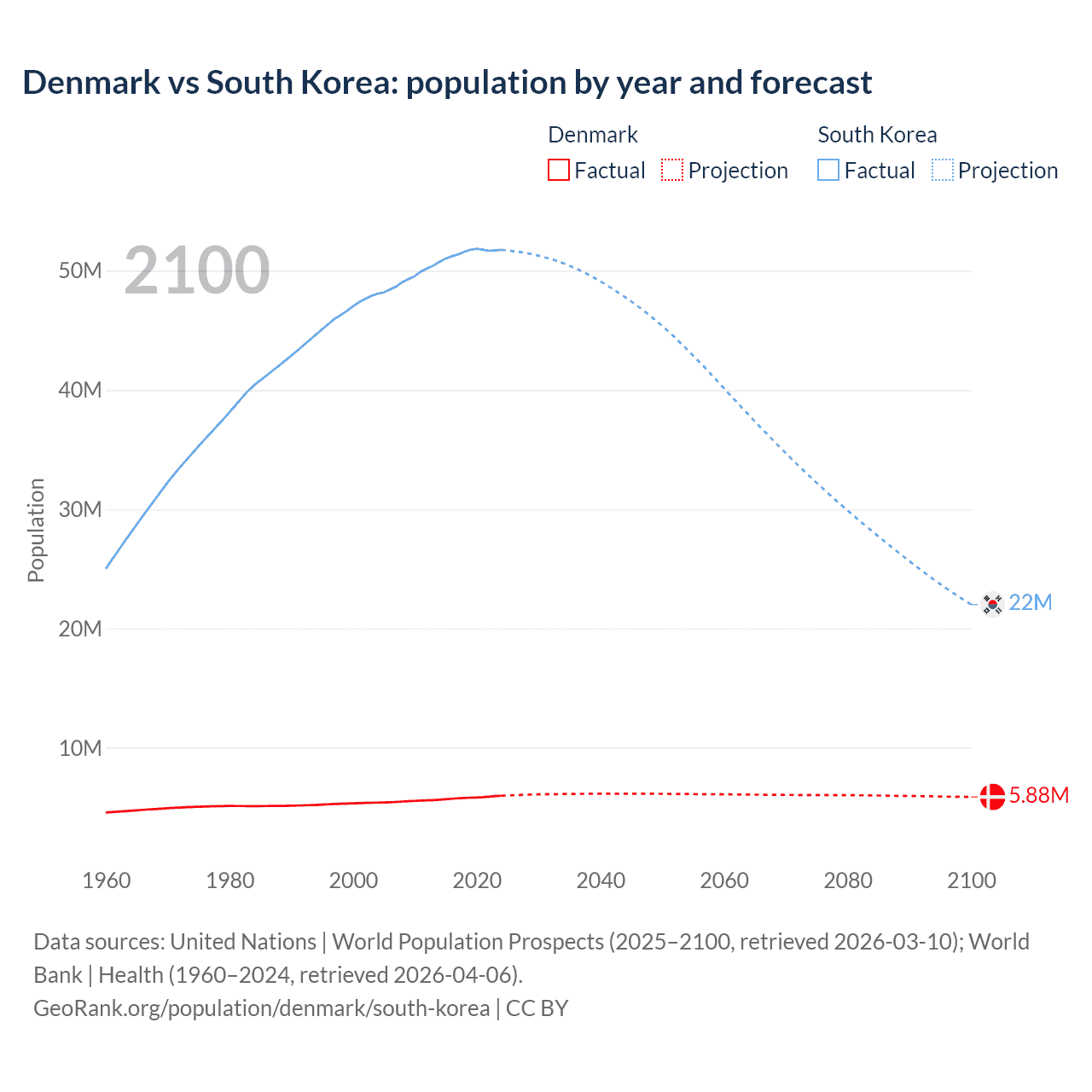 The latest officially reported population of Denmark was 5,976,992 in 2024 vs 51,751,065 people in South Korea in 2024. In 2026, based on the adjusted UN estimation, the current Denmark's population is 6,032,403 people compared to 51,649,918 in South Korea.