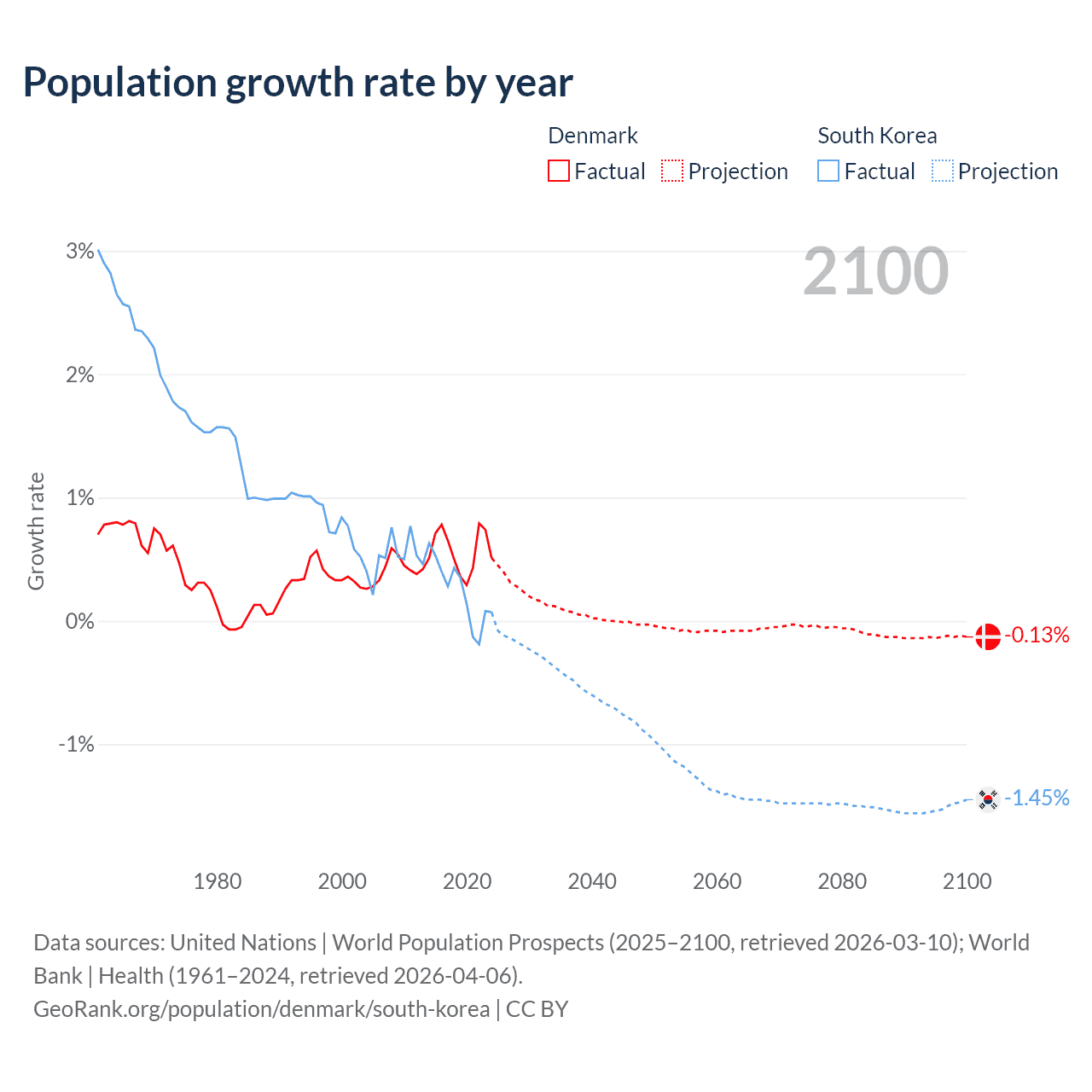 - For the last 10 years, Denmark has had an average growth rate of +0.57% per year vs +0.24% in South Korea.