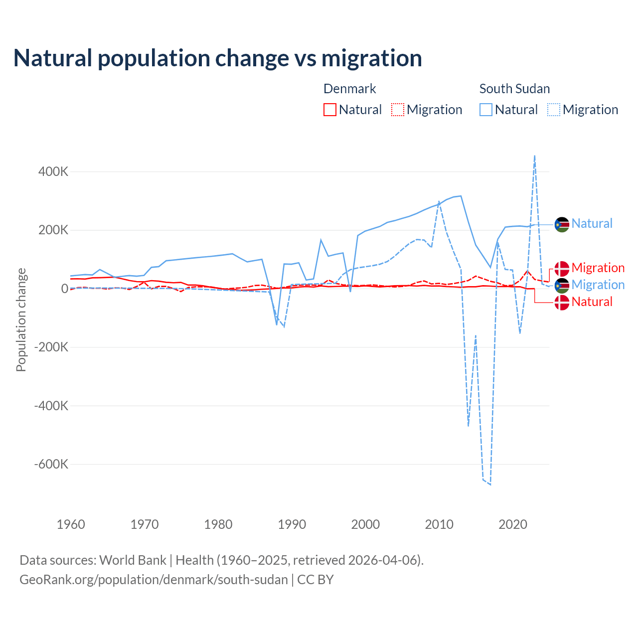 Over the last 10 years, 15.4% of the population change in Denmark is from natural causes (a gain of 51,826 people) and 84.6% is from migration (a gain of 284,848 people). In South Sudan 57.4% is from natural causes (a gain of 1,792,135 people) and 42.6% is from migration (a loss of 1,329,606 people).