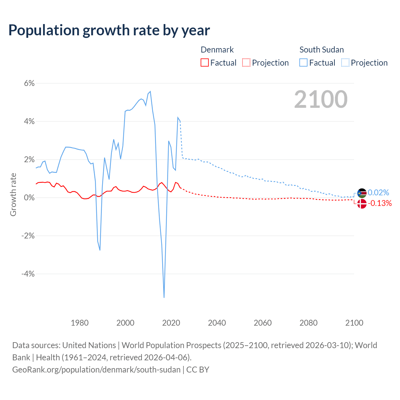 - For the last 10 years, Denmark has had an average growth rate of +0.57% per year vs +0.65% in South Sudan.