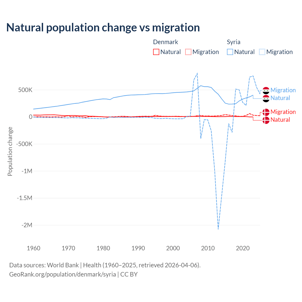 Over the last 10 years, 15.4% of the population change in Denmark is from natural causes (a gain of 51,826 people) and 84.6% is from migration (a gain of 284,848 people). In Syria 91.3% is from natural causes (a gain of 3,047,621 people) and 8.72% is from migration (a gain of 291,069 people).