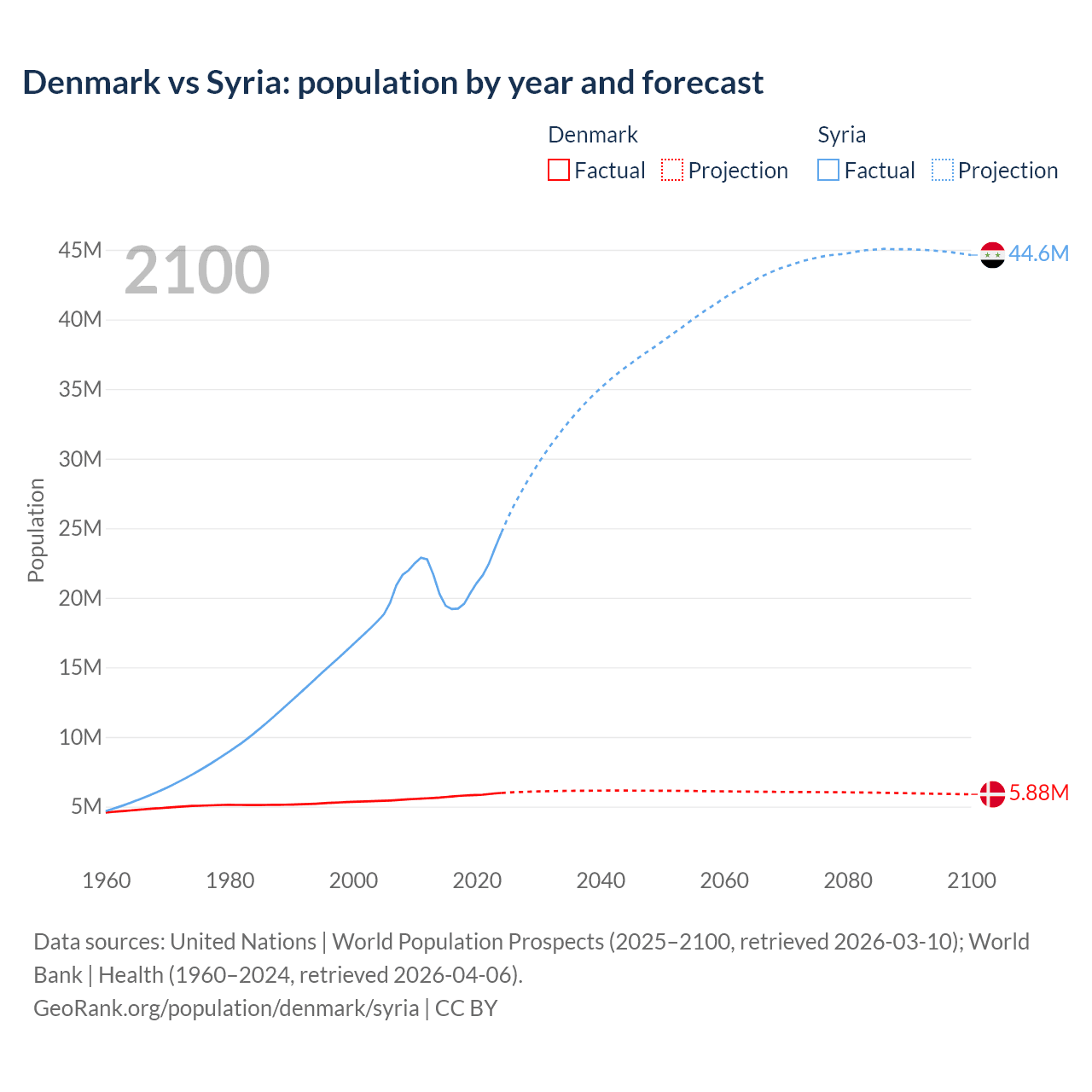 The latest officially reported population of Denmark was 5,976,992 in 2024 vs 24,672,760 people in Syria in 2024. In 2026, based on the adjusted UN estimation, the current Denmark's population is 6,032,403 people compared to 26,829,400 in Syria.