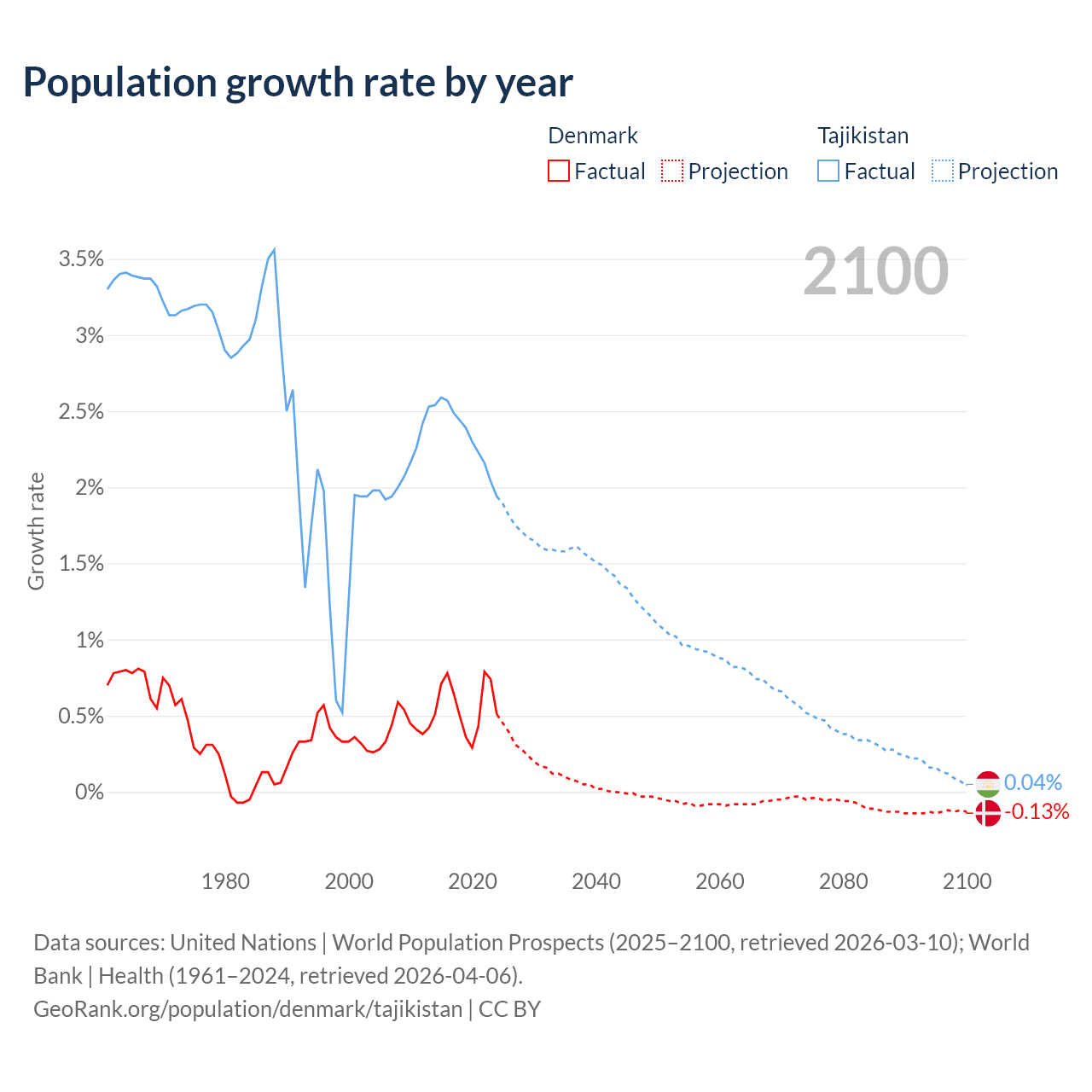 - For the last 10 years, Denmark has had an average growth rate of +0.57% per year vs +2.33% in Tajikistan.