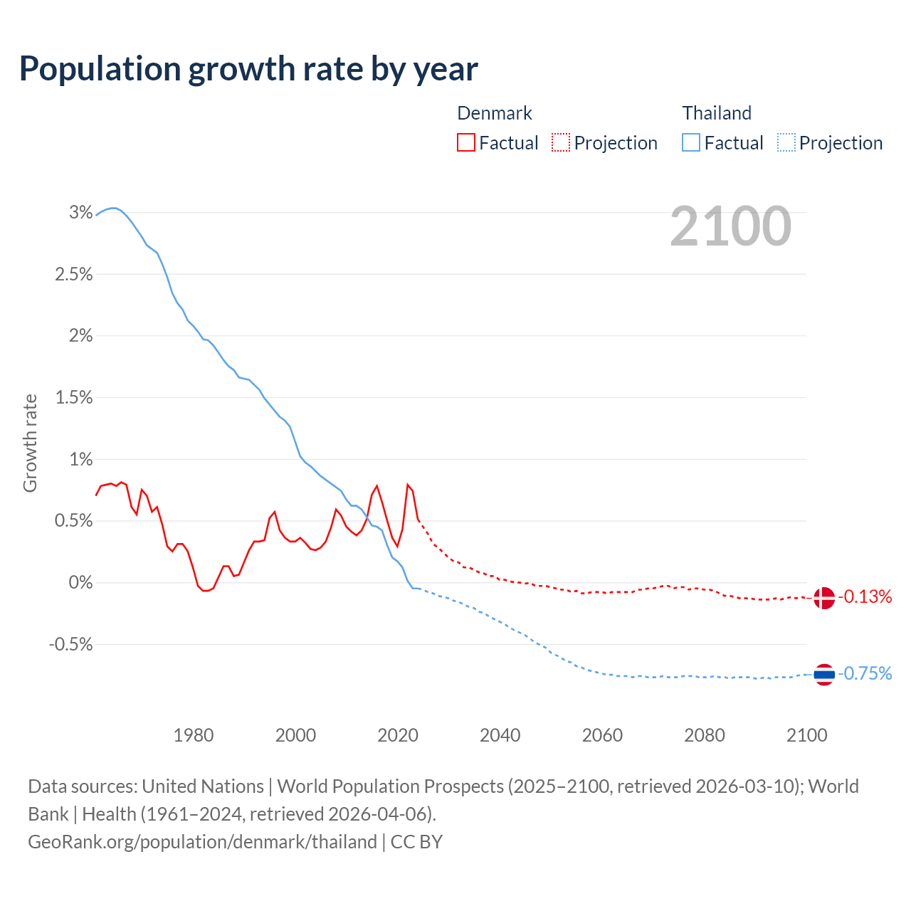 - For the last 10 years, Denmark has had an average growth rate of +0.57% per year vs +0.23% in Thailand.