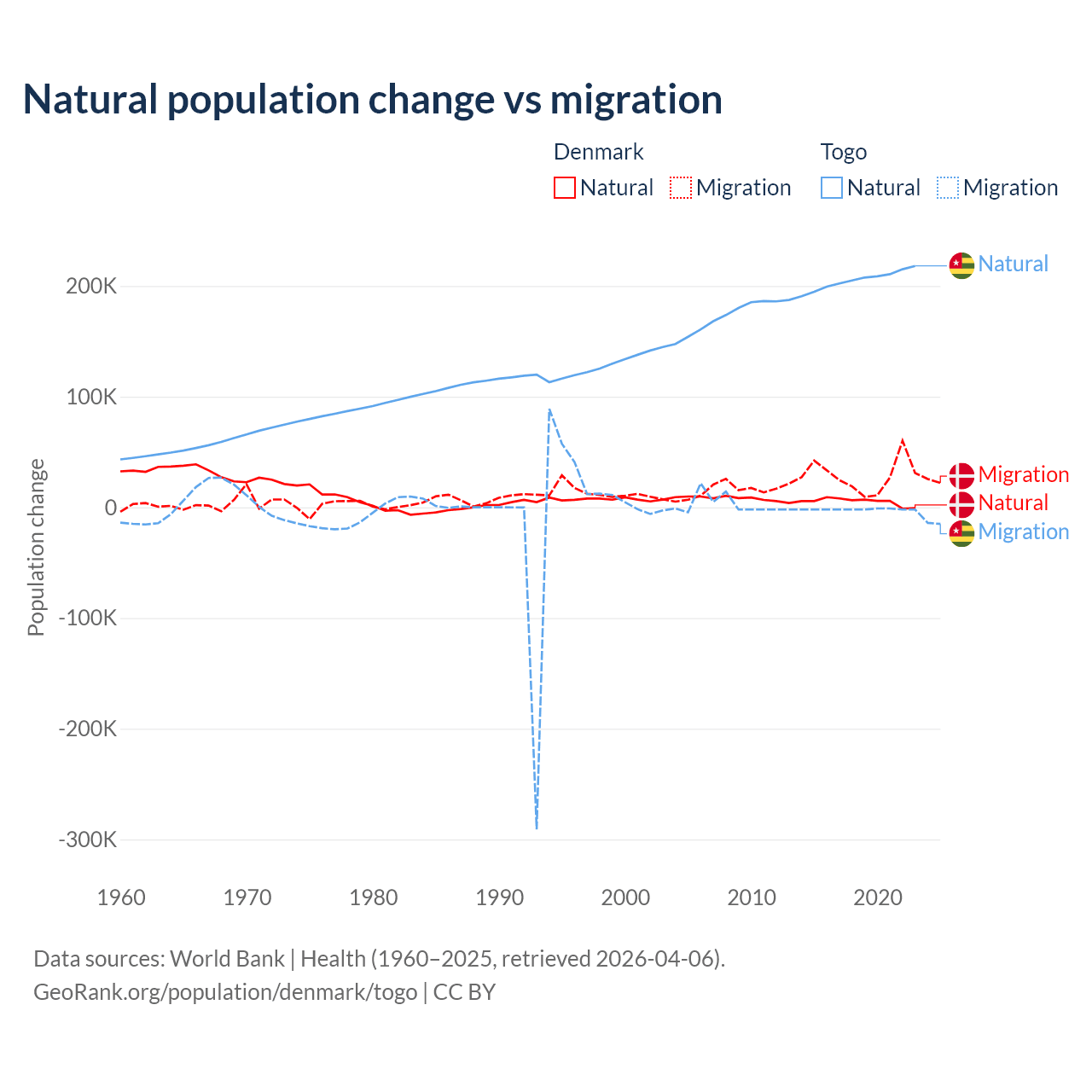 Over the last 10 years, 15.4% of the population change in Denmark is from natural causes (a gain of 51,826 people) and 84.6% is from migration (a gain of 284,848 people). In Togo 99.1% is from natural causes (a gain of 2,052,115 people) and 0.86% is from migration (a loss of 17,852 people).