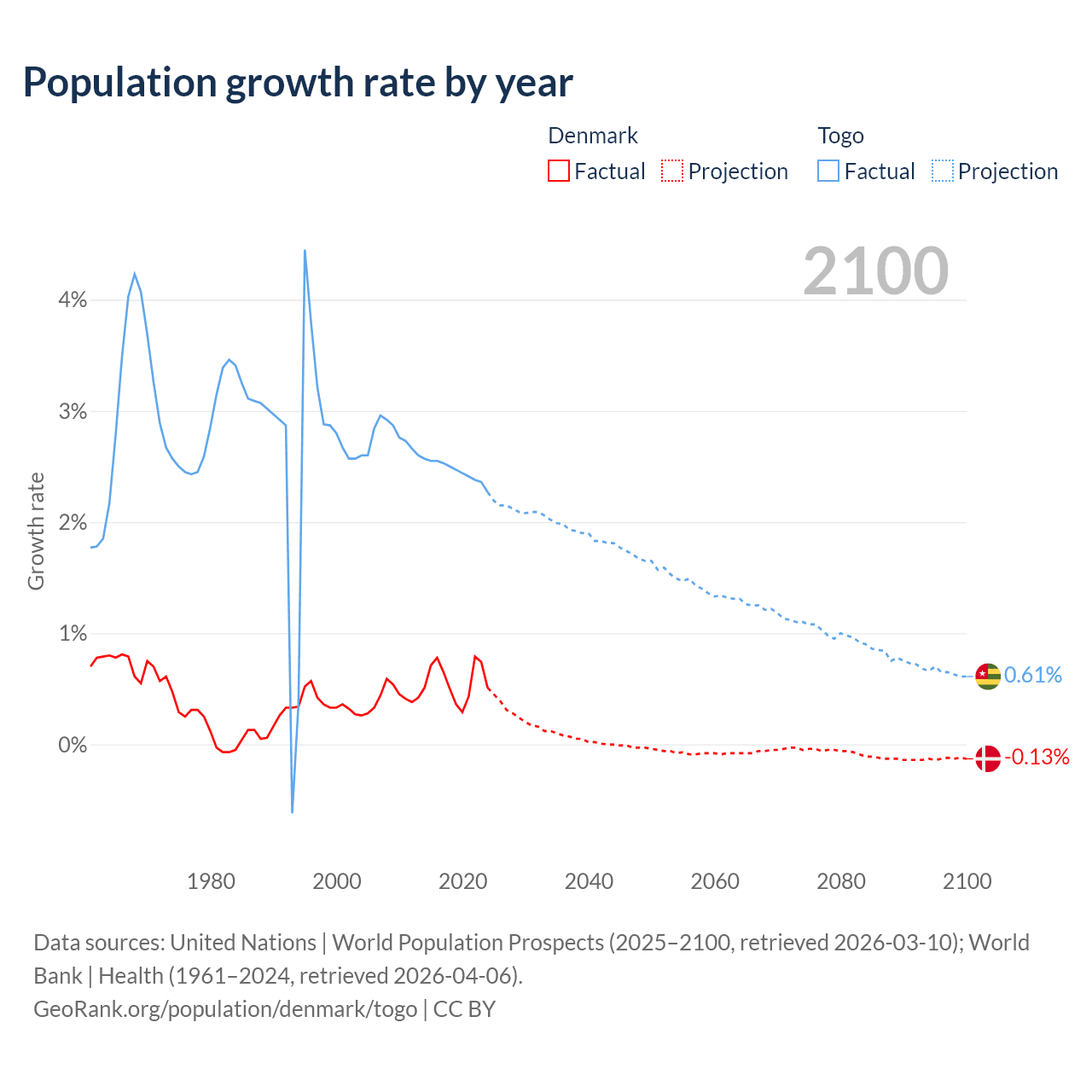 - For the last 10 years, Denmark has had an average growth rate of +0.57% per year vs +2.46% in Togo.