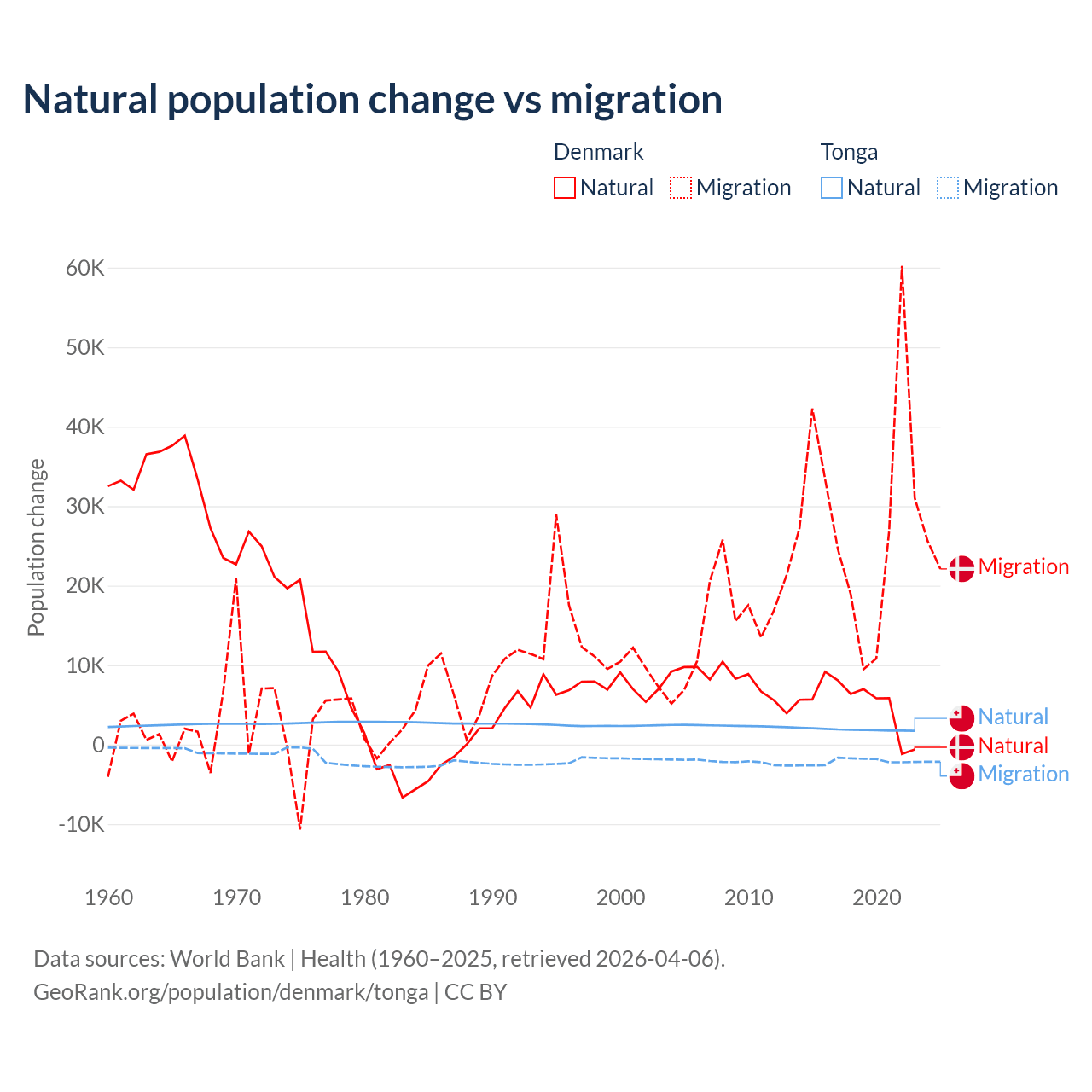 Over the last 10 years, 15.4% of the population change in Denmark is from natural causes (a gain of 51,826 people) and 84.6% is from migration (a gain of 284,848 people). In Tonga 46.9% is from natural causes (a gain of 18,919 people) and 53.1% is from migration (a loss of 21,384 people).