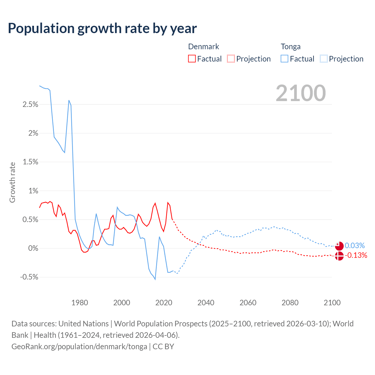 - For the last 10 years, Denmark has had an average growth rate of +0.57% per year vs -0.25% in Tonga.