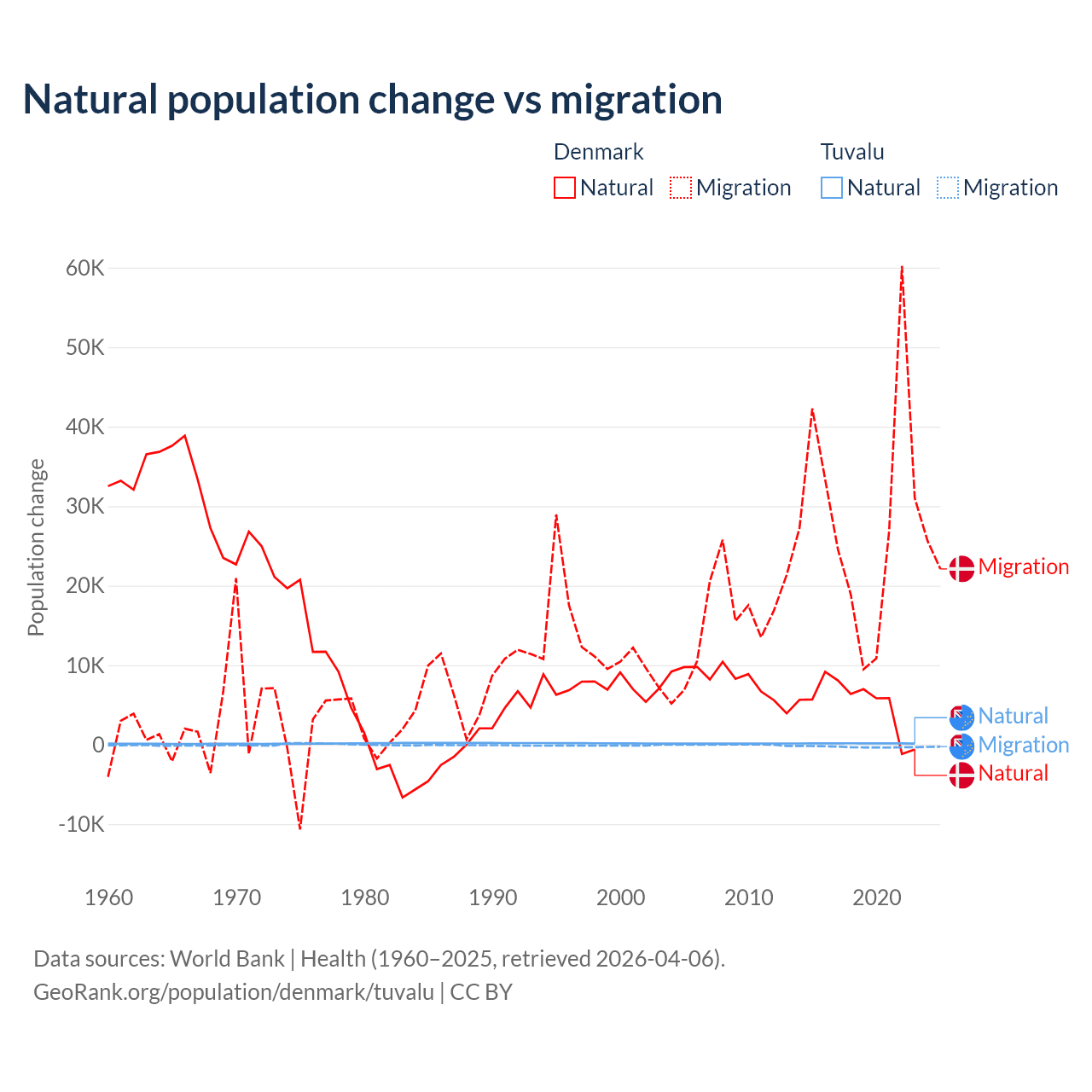 Over the last 10 years, 15.4% of the population change in Denmark is from natural causes (a gain of 51,826 people) and 84.6% is from migration (a gain of 284,848 people). In Tuvalu 35.5% is from natural causes (a gain of 1,556 people) and 64.5% is from migration (a loss of 2,827 people).