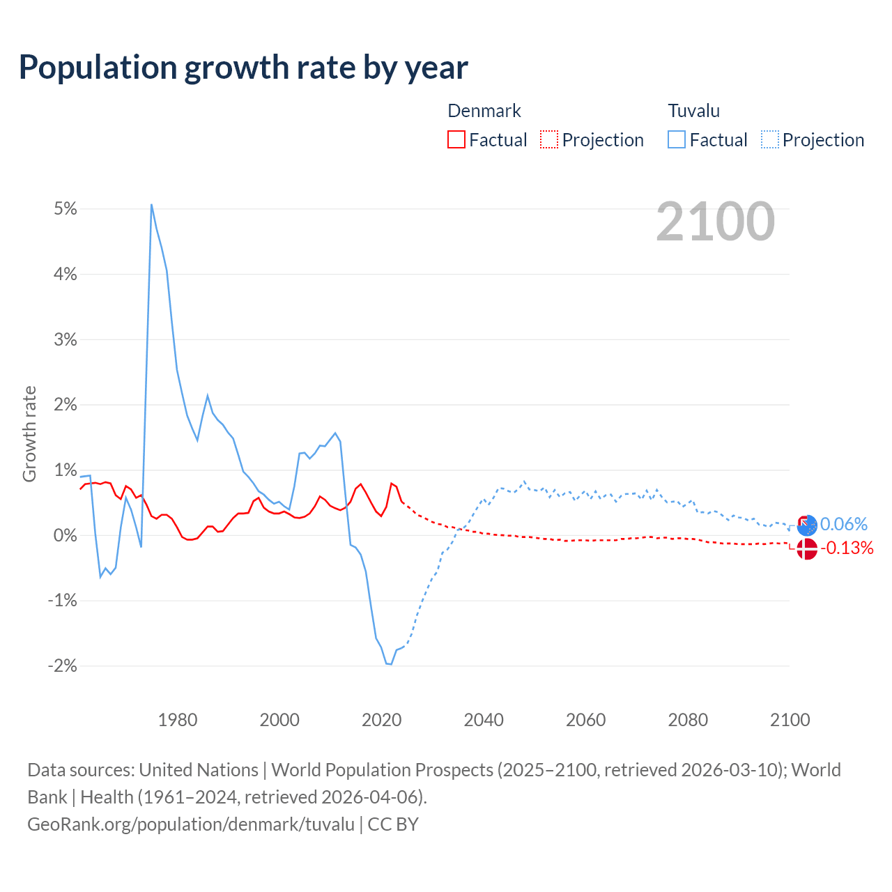 - For the last 10 years, Denmark has had an average growth rate of +0.57% per year vs -1.19% in Tuvalu.