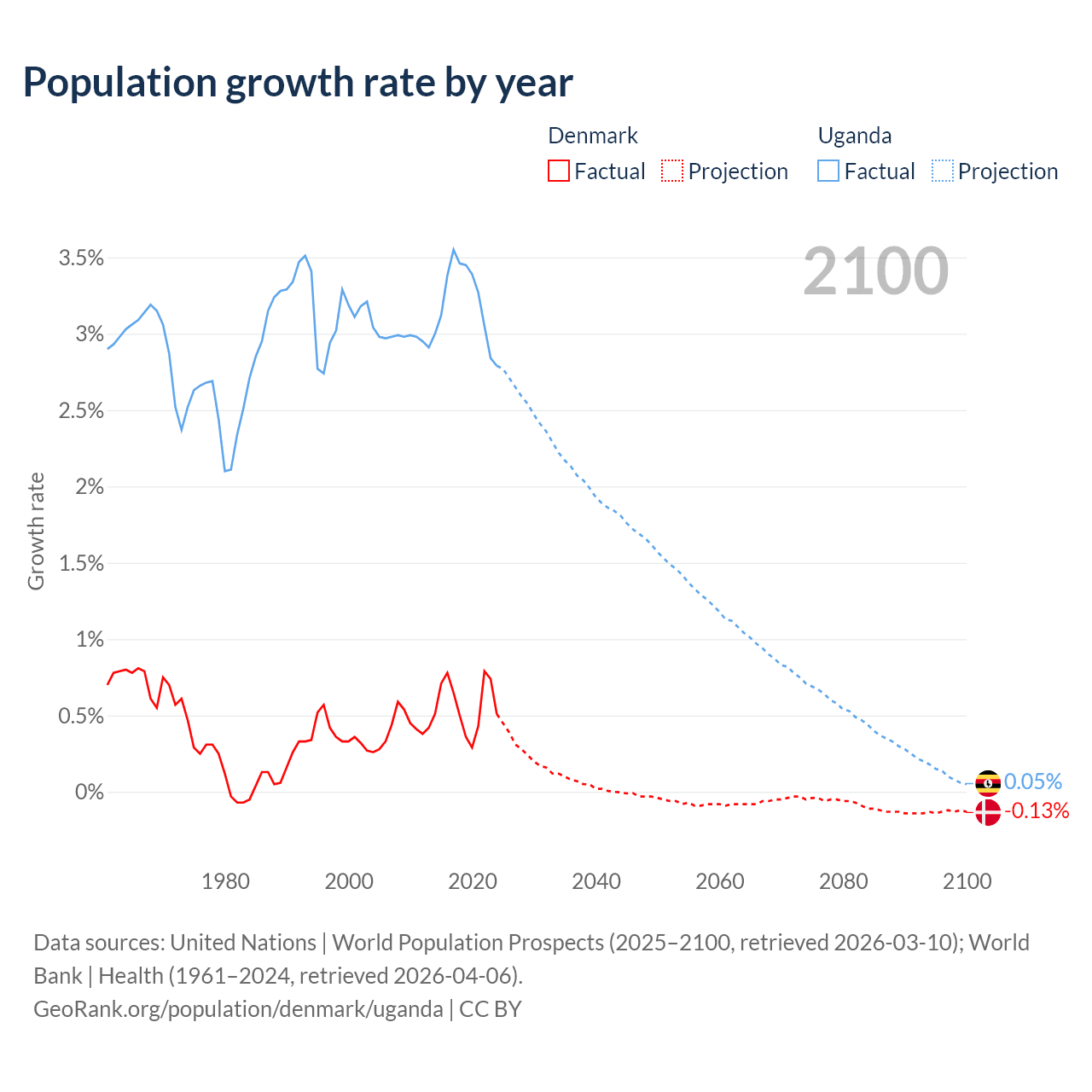 - For the last 10 years, Denmark has had an average growth rate of +0.57% per year vs +3.21% in Uganda.