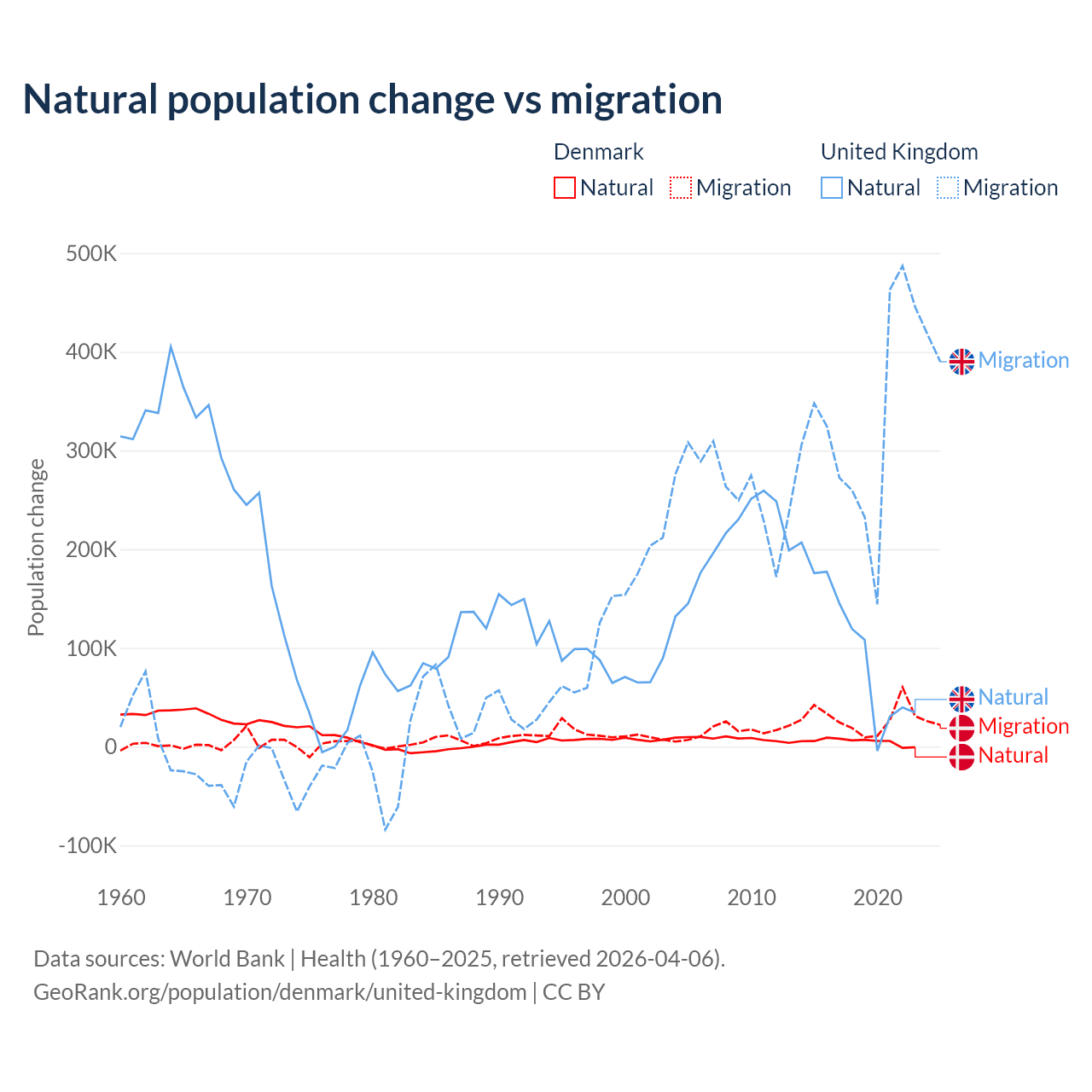 Over the last 10 years, 15.4% of the population change in Denmark is from natural causes (a gain of 51,826 people) and 84.6% is from migration (a gain of 284,848 people). In the United Kingdom 23.9% is from natural causes (a gain of 1,033,129 people) and 76.1% is from migration (a gain of 3,283,101 people).