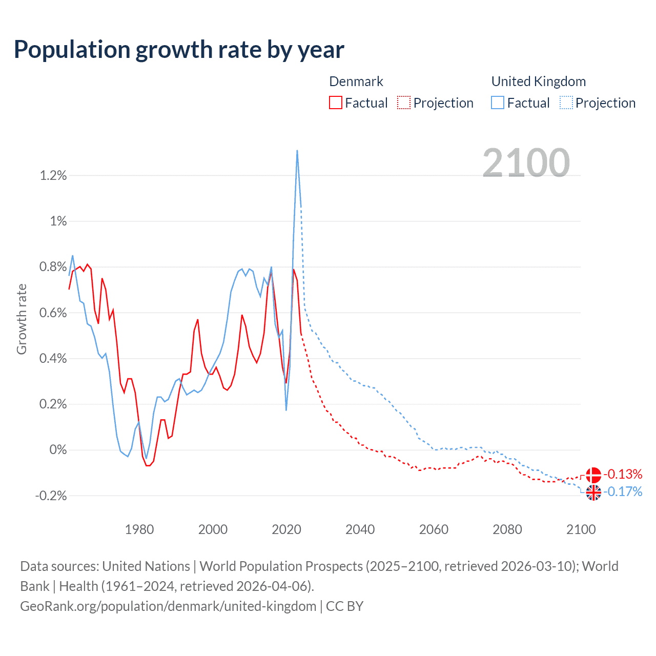 - For the last 10 years, Denmark has had an average growth rate of +0.57% per year vs +0.7% in the United Kingdom.