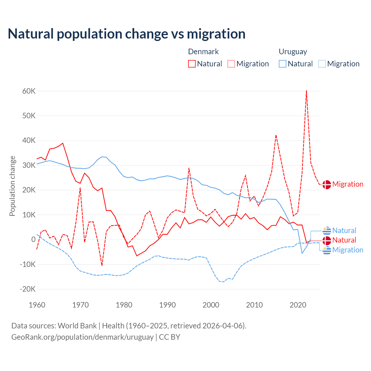Over the last 10 years, 15.4% of the population change in Denmark is from natural causes (a gain of 51,826 people) and 84.6% is from migration (a gain of 284,848 people). In Uruguay 70% is from natural causes (a gain of 64,303 people) and 30% is from migration (a loss of 27,501 people).