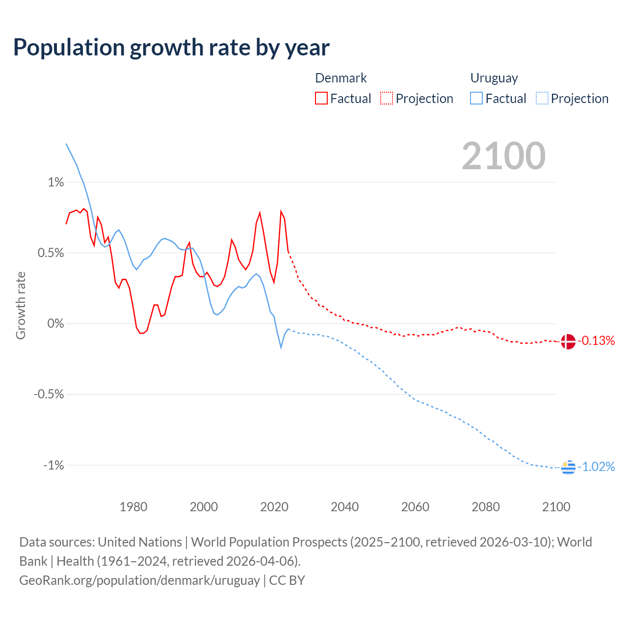 - For the last 10 years, Denmark has had an average growth rate of +0.57% per year vs +0.11% in Uruguay.