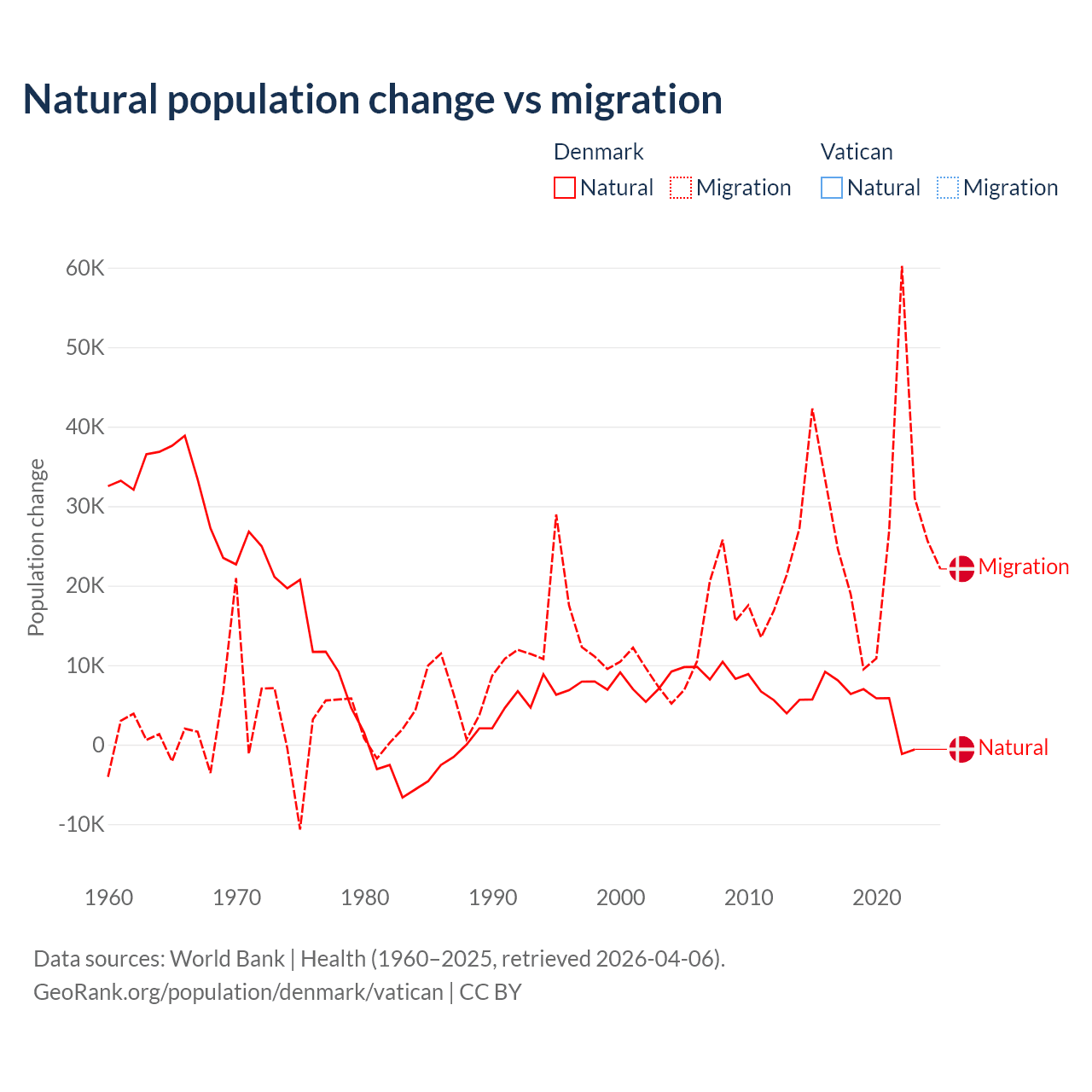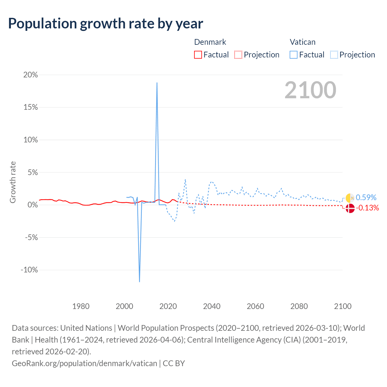 - For the last 10 years, Denmark has had an average growth rate of +0.57% per year vs +1.9% in the Vatican.