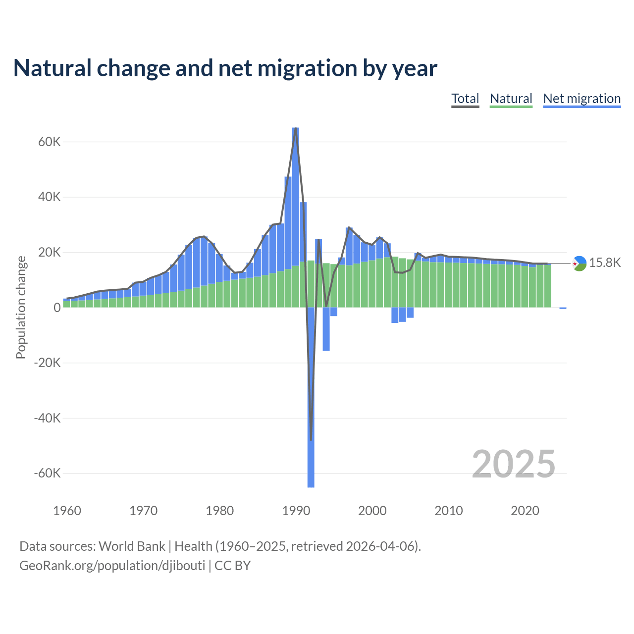Over the last 10 years, 92.1% of the population change in Djibouti is from natural causes (a gain of 153,892 people) and 7.87% is from migration (a gain of 13,138 people).