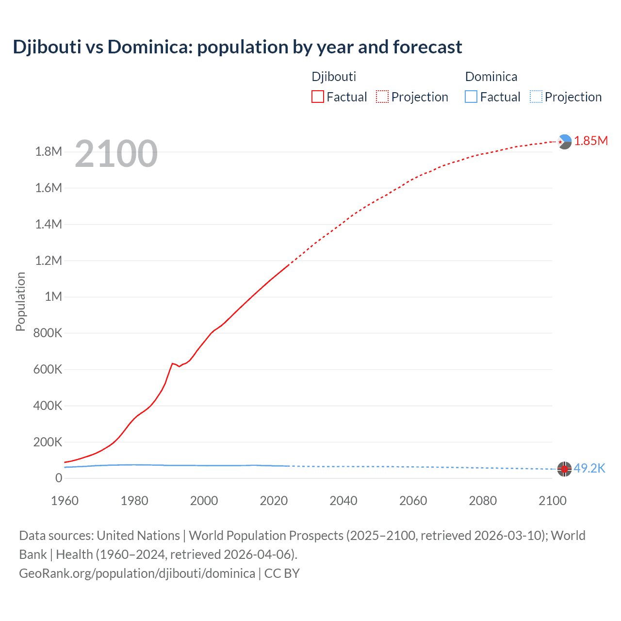 Djibouti vs Dominica: population by year and forecast