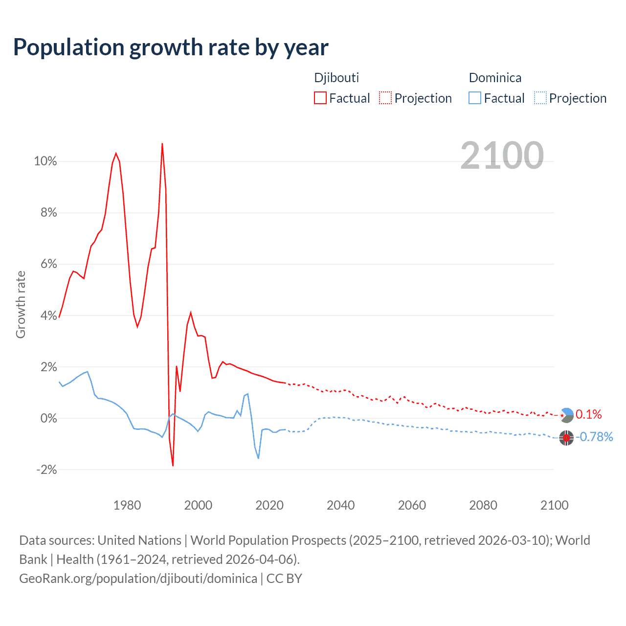 - For the last 10 years, Djibouti has had an average growth rate of +1.57% per year vs -0.47% in Dominica.