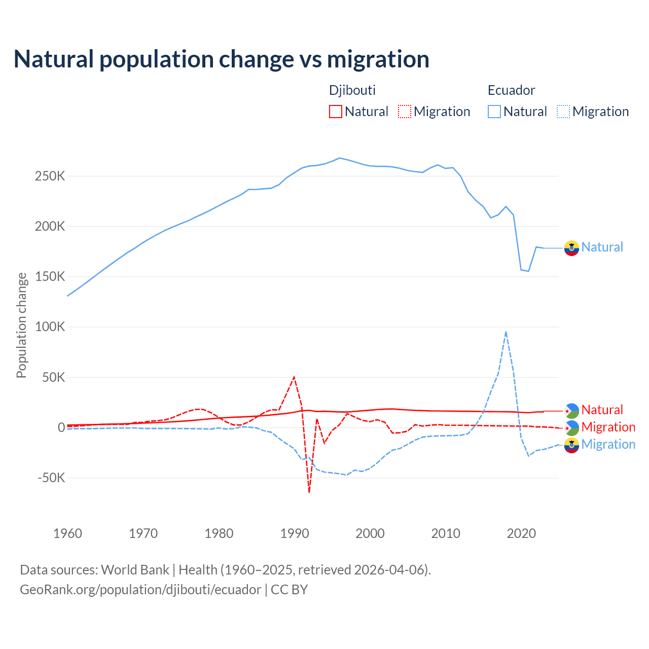 Over the last 10 years, 92.1% of the population change in Djibouti is from natural causes (a gain of 153,892 people) and 7.87% is from migration (a gain of 13,138 people). In Ecuador 91.9% is from natural causes (a gain of 1,964,352 people) and 8.08% is from migration (a gain of 172,707 people).