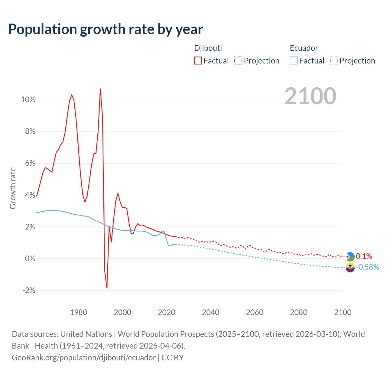 - For the last 10 years, Djibouti has had an average growth rate of +1.57% per year vs +1.26% in Ecuador.