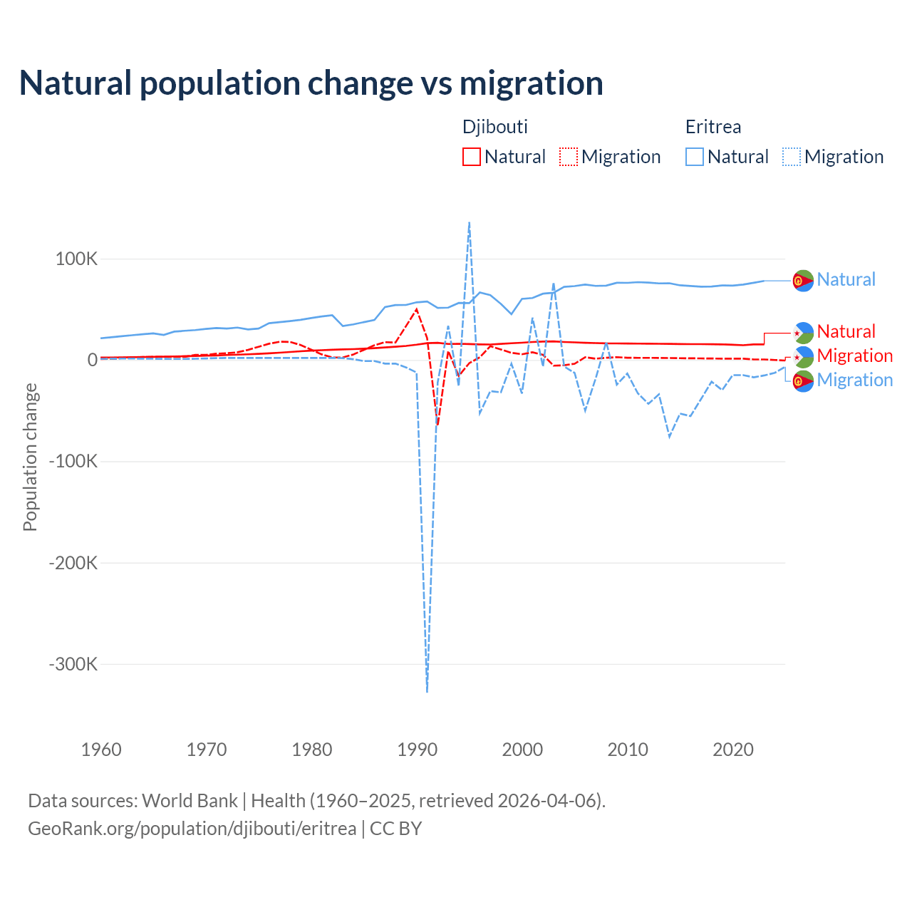 Over the last 10 years, 92.1% of the population change in Djibouti is from natural causes (a gain of 153,892 people) and 7.87% is from migration (a gain of 13,138 people). In Eritrea 68.8% is from natural causes (a gain of 742,837 people) and 31.2% is from migration (a loss of 336,243 people).