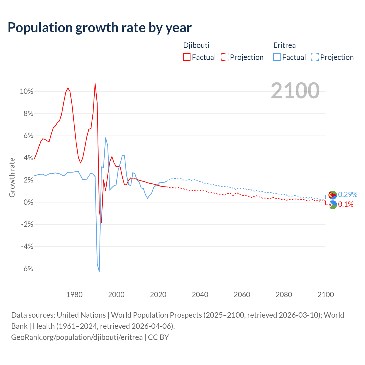 - For the last 10 years, Djibouti has had an average growth rate of +1.57% per year vs +1.28% in Eritrea.