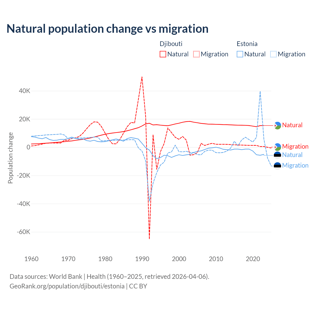 Over the last 10 years, 92.1% of the population change in Djibouti is from natural causes (a gain of 153,892 people) and 7.87% is from migration (a gain of 13,138 people). In Estonia 26.1% is from natural causes (a loss of 27,683 people) and 73.9% is from migration (a gain of 78,553 people).