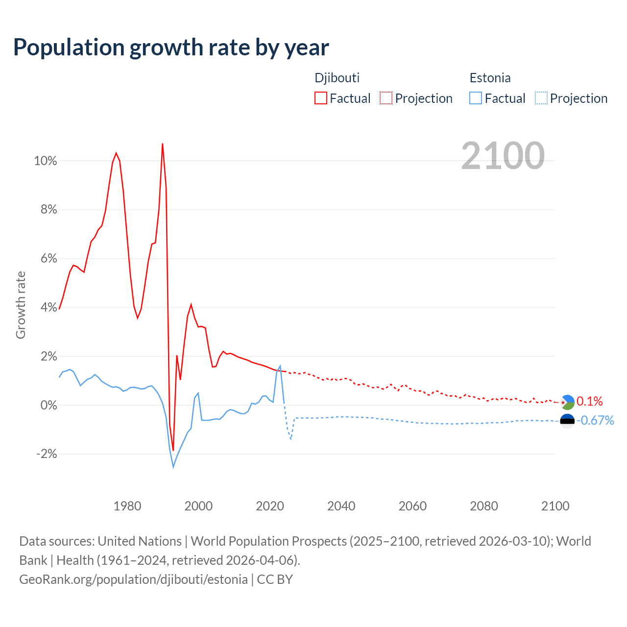 - For the last 10 years, Djibouti has had an average growth rate of +1.57% per year vs +0.37% in Estonia.