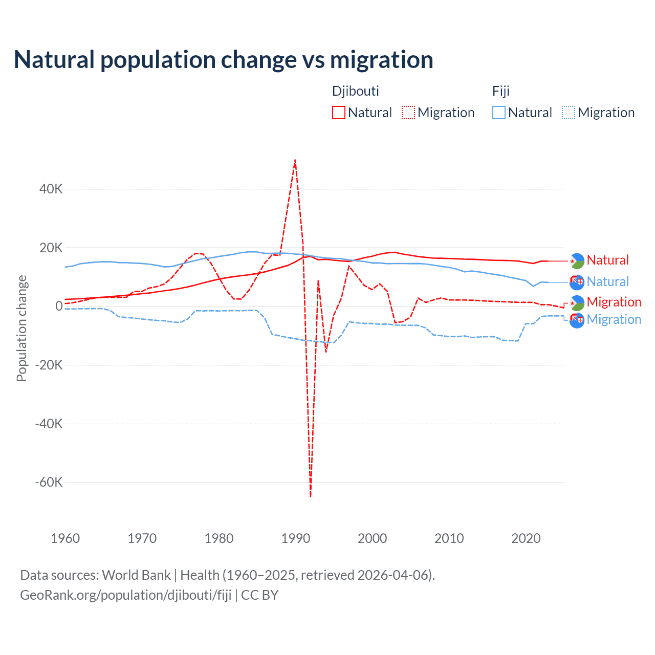 Over the last 10 years, 92.1% of the population change in Djibouti is from natural causes (a gain of 153,892 people) and 7.87% is from migration (a gain of 13,138 people). In Fiji 52.6% is from natural causes (a gain of 94,971 people) and 47.4% is from migration (a loss of 85,415 people).
