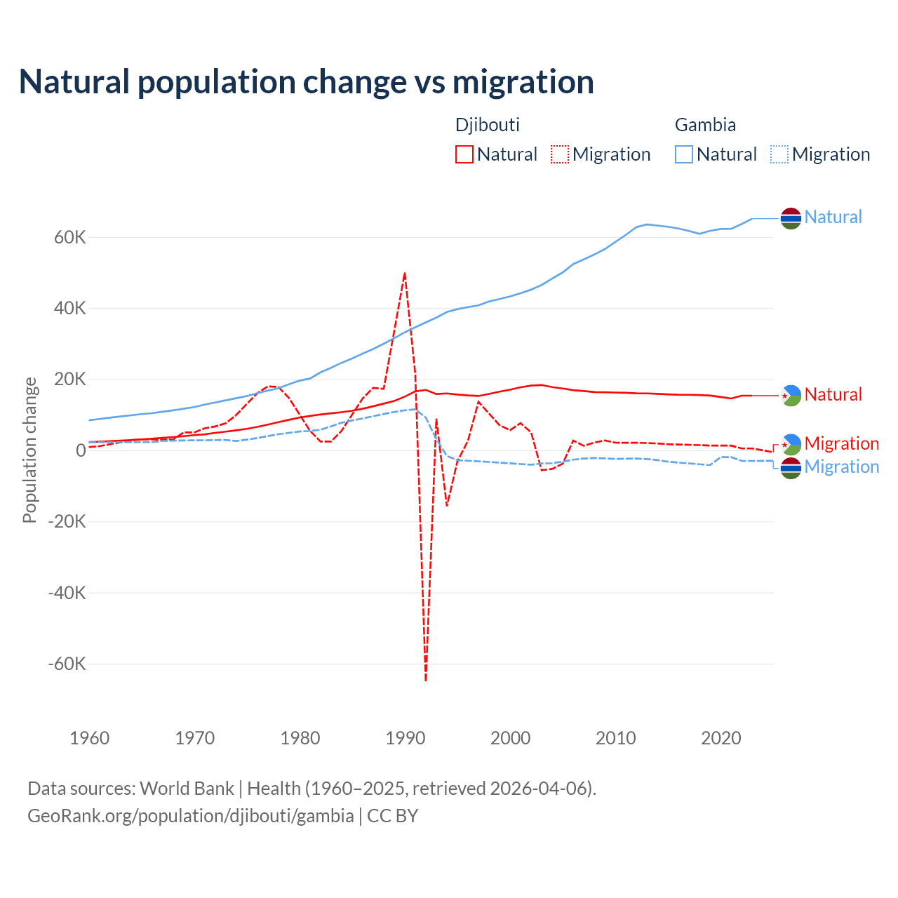 Over the last 10 years, 92.1% of the population change in Djibouti is from natural causes (a gain of 153,892 people) and 7.87% is from migration (a gain of 13,138 people). In the Gambia 95.2% is from natural causes (a gain of 625,795 people) and 4.75% is from migration (a loss of 31,227 people).