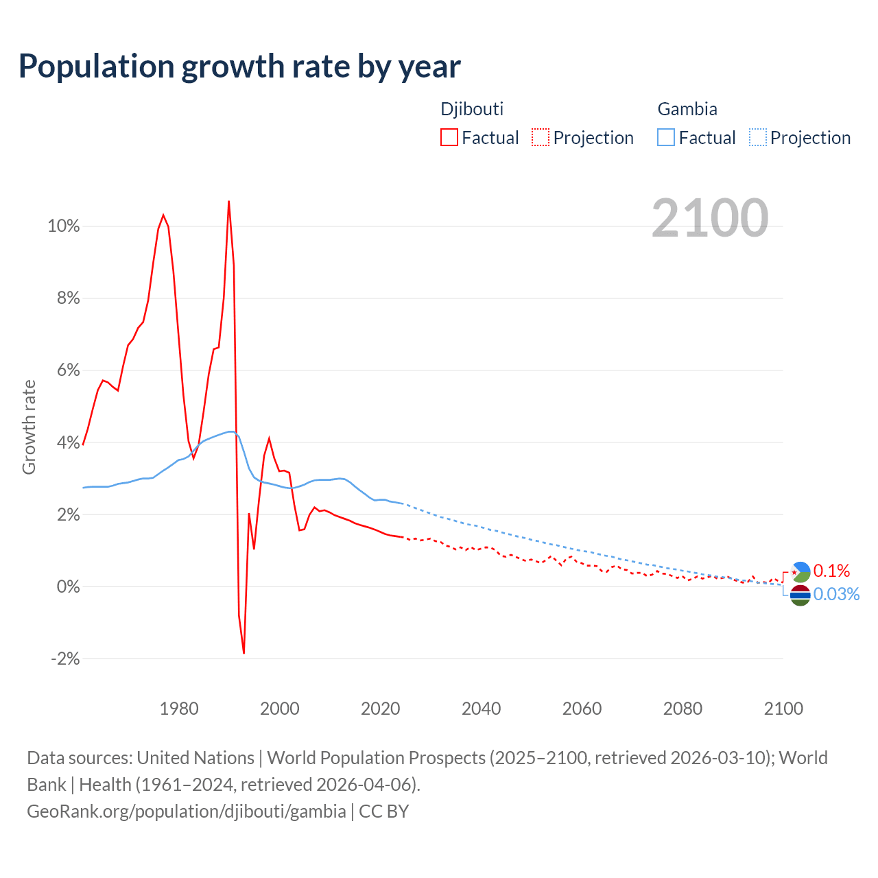 - For the last 10 years, Djibouti has had an average growth rate of +1.57% per year vs +2.5% in the Gambia.
