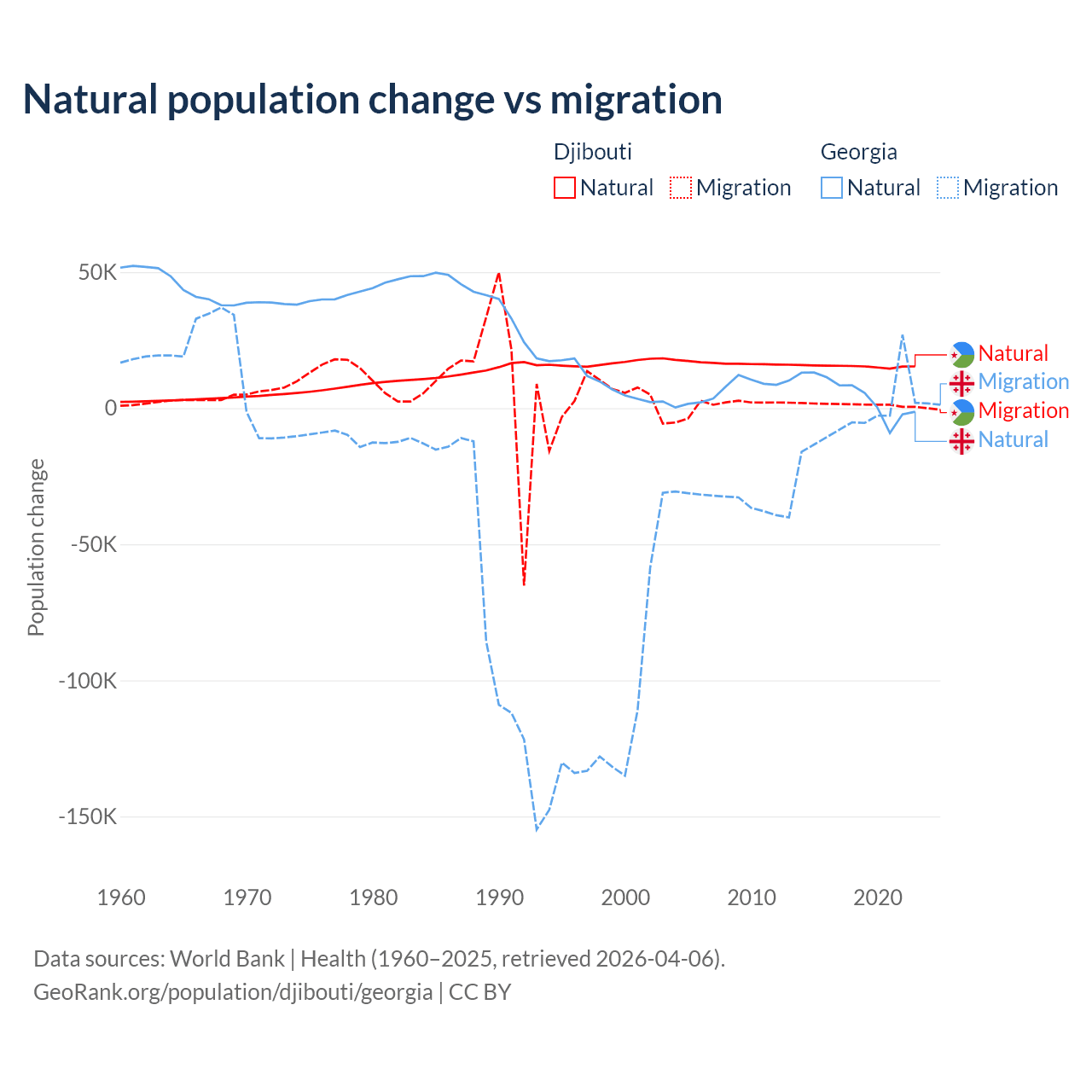 Over the last 10 years, 92.1% of the population change in Djibouti is from natural causes (a gain of 153,892 people) and 7.87% is from migration (a gain of 13,138 people). In Georgia 57.7% is from natural causes (a gain of 47,646 people) and 42.3% is from migration (a loss of 34,907 people).