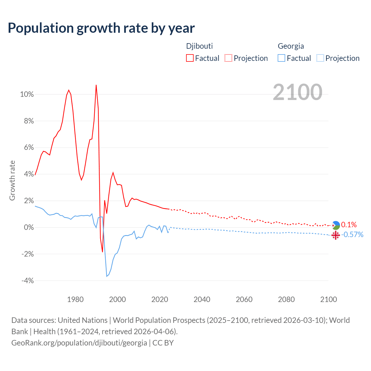 - For the last 10 years, Djibouti has had an average growth rate of +1.57% per year vs -0.04% in Georgia.