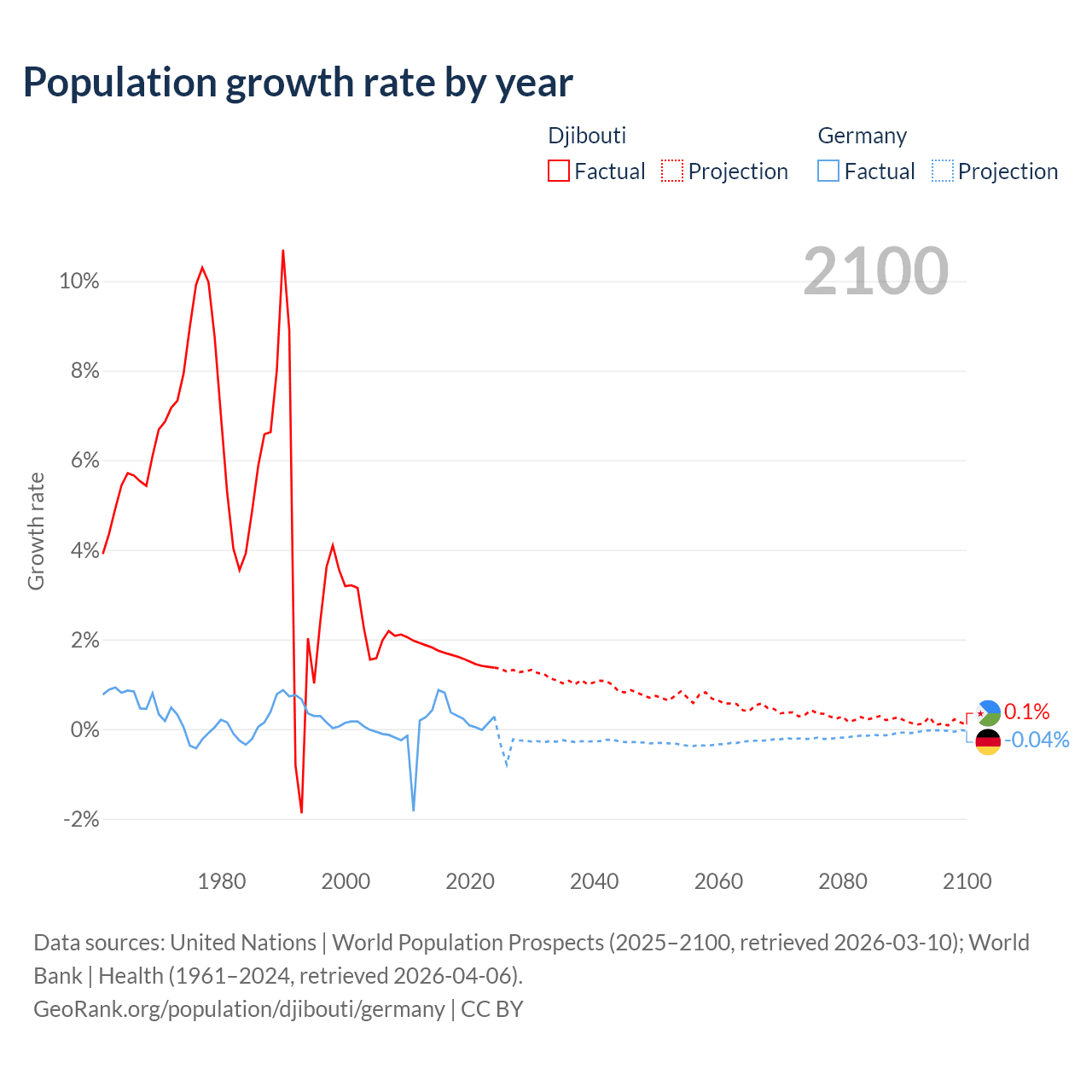 - For the last 10 years, Djibouti has had an average growth rate of +1.57% per year vs +0.32% in Germany.