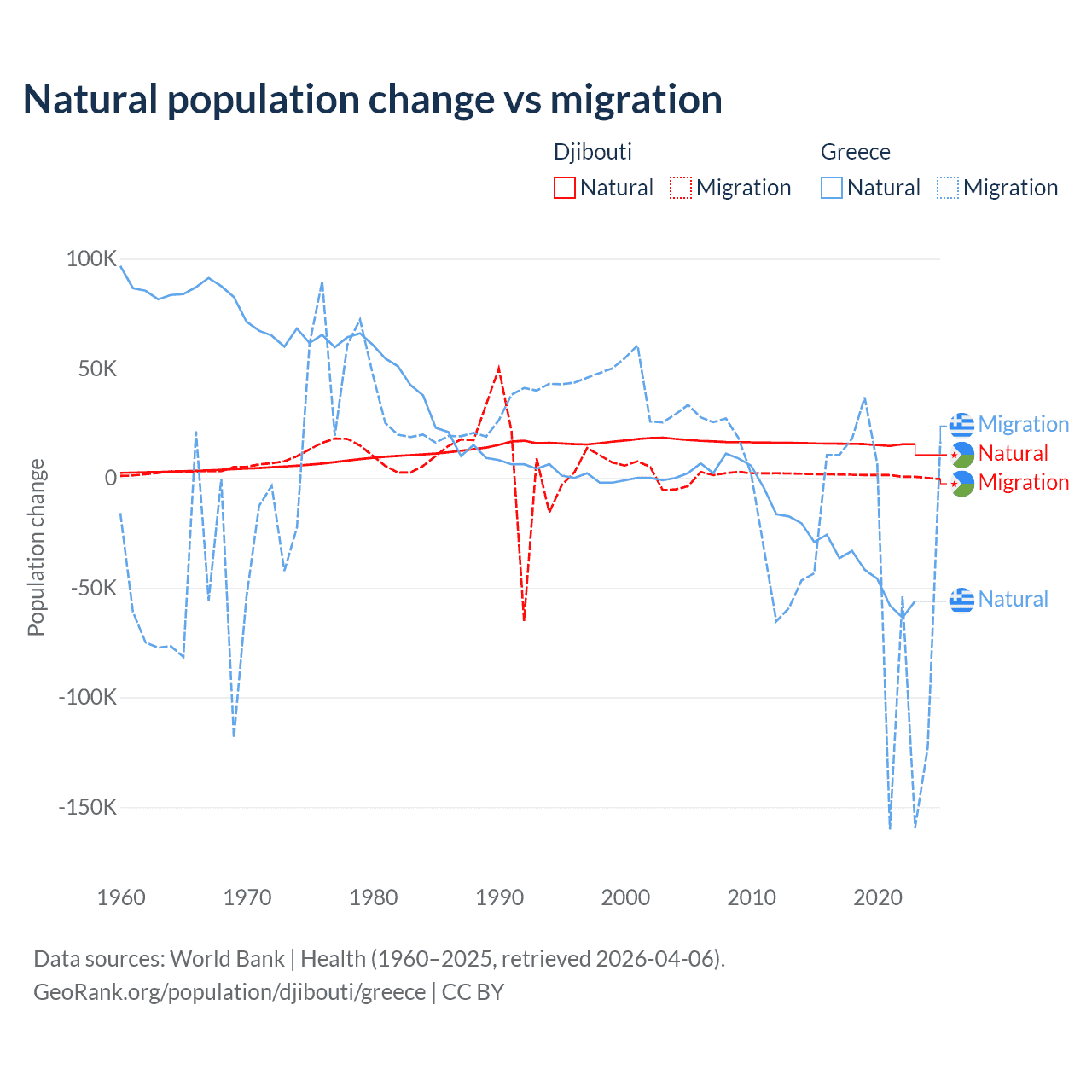 Over the last 10 years, 92.1% of the population change in Djibouti is from natural causes (a gain of 153,892 people) and 7.87% is from migration (a gain of 13,138 people). In Greece 51.9% is from natural causes (a loss of 411,426 people) and 48.1% is from migration (a loss of 381,824 people).