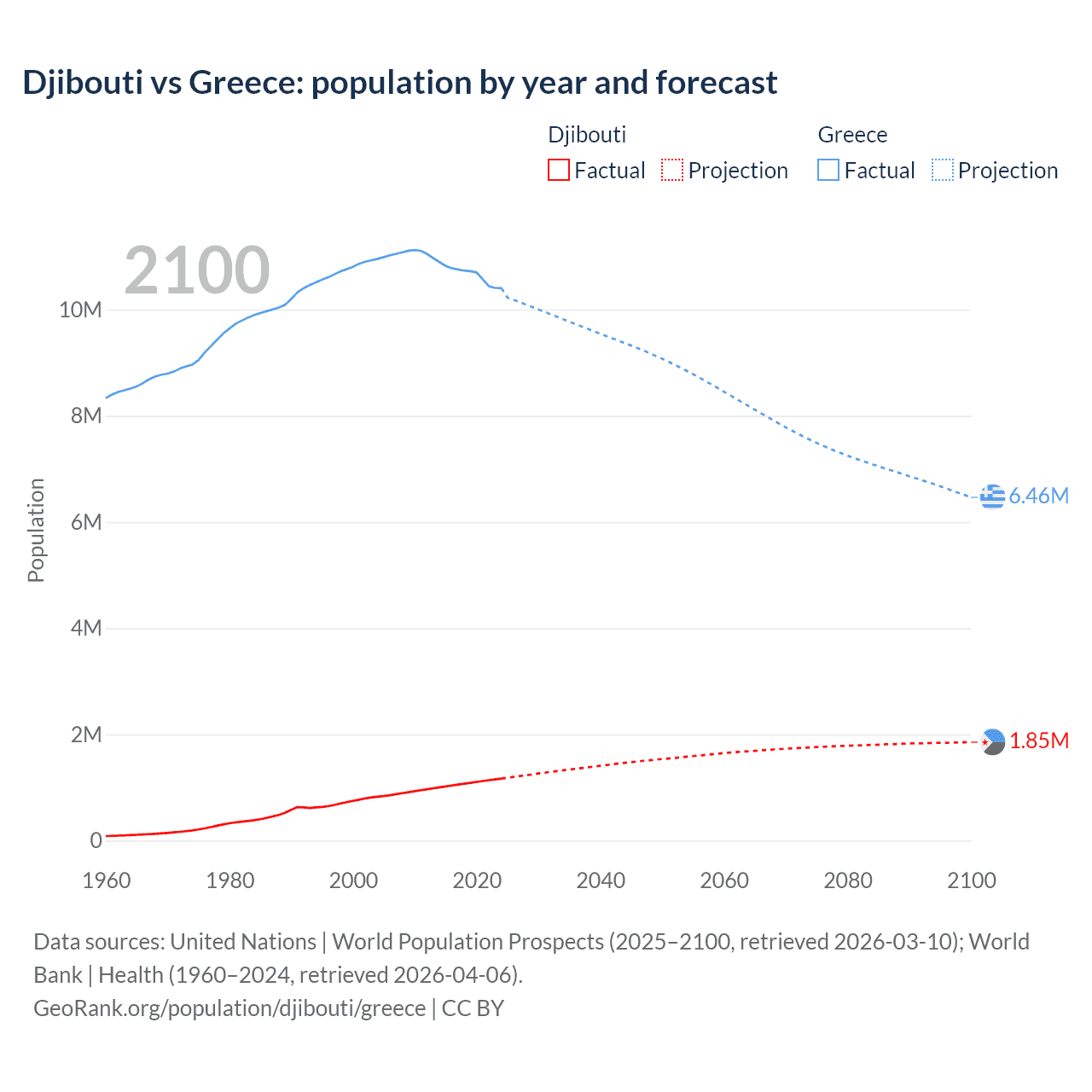 - Since 2006, the population of Djibouti has increased from 856K people to 1.2M (40.7% growth), while Greece has declined from 11M to 10.2M (7.61% decline).