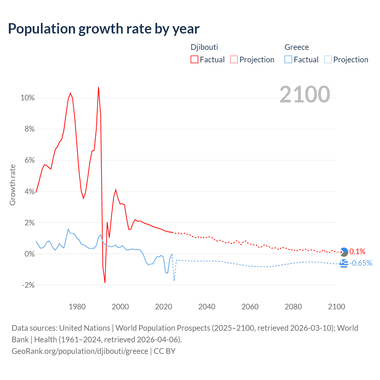- For the last 10 years, Djibouti has had an average growth rate of +1.57% per year vs -0.47% in Greece.