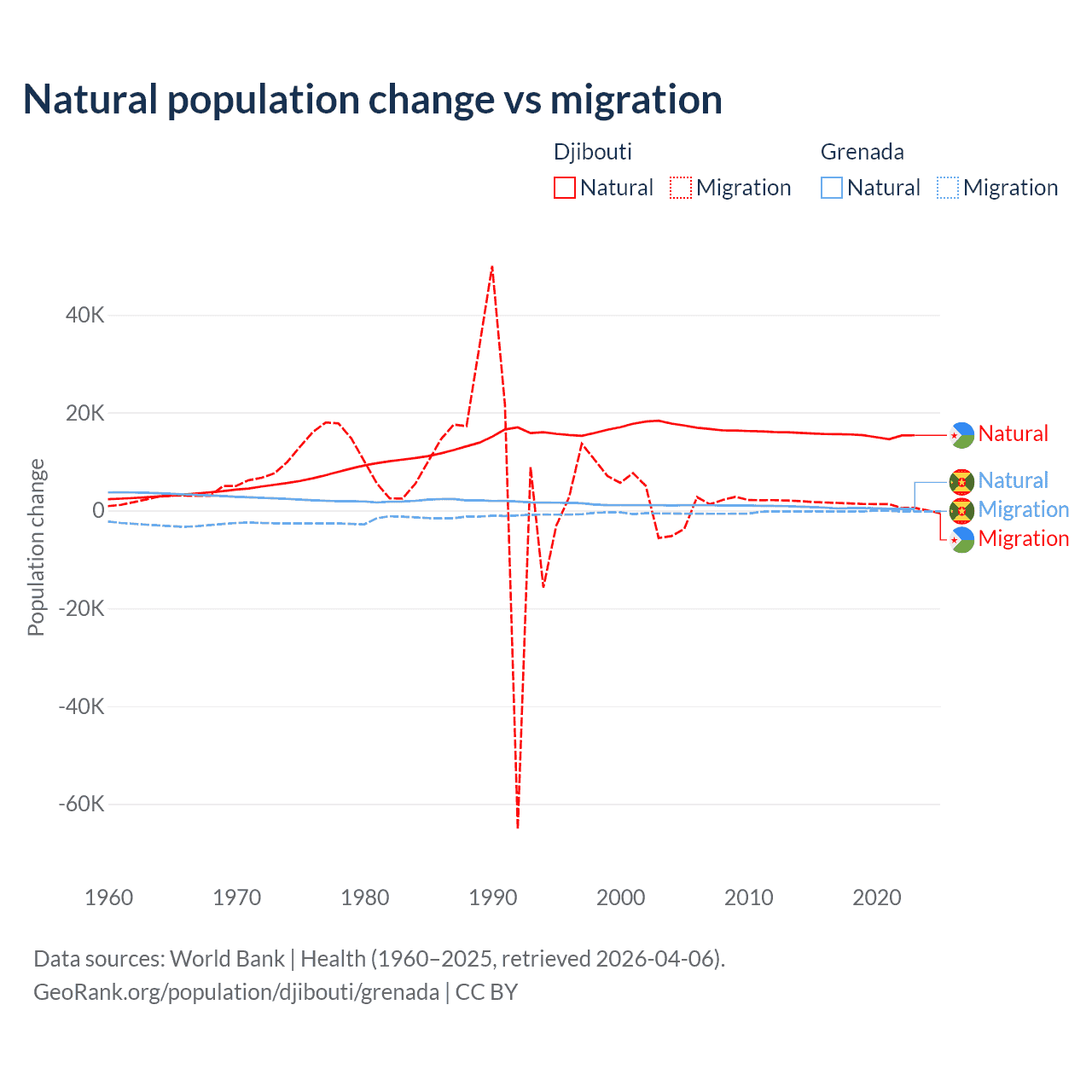 Over the last 10 years, 92.1% of the population change in Djibouti is from natural causes (a gain of 153,892 people) and 7.87% is from migration (a gain of 13,138 people). In Grenada 76% is from natural causes (a gain of 4,850 people) and 24% is from migration (a loss of 1,535 people).