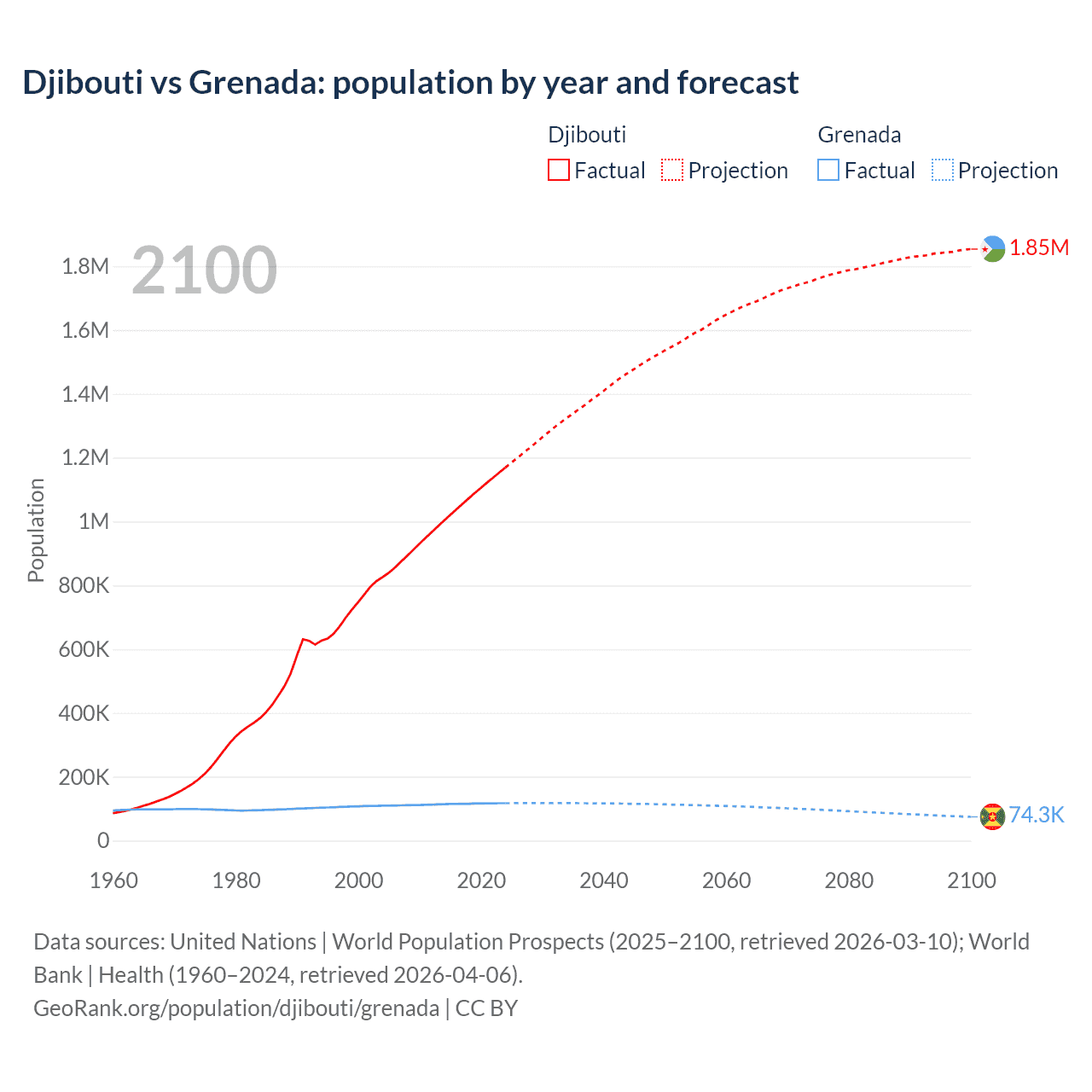 The latest officially reported population of Djibouti was 1,168,722 in 2024 vs 117,207 people in Grenada in 2024. In 2026, based on the adjusted UN estimation, the current Djibouti's population is 1,203,929 people compared to 117,407 in Grenada.